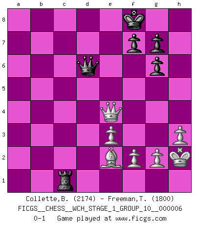 Last move : 0-1 2009 June 7 7:25:21 [Event "FICGS__CHESS__WCH_STAGE_1_GROUP_10__000006"] [Site "FICGS"] [Date "2009.02.03"] [Round "1"] [White "Collette,Benjamin"] [Black "Freeman,Thomas"] [Result "0-1"] [WhiteElo "2174"] [BlackElo "1800"] 1.d4 d5 2.c4 c6 3.Nf3 Nf6 4.e3 Bf5 5.Nc3 e6 6.Nh4 Bg6 7.Be2 dxc4 8.Nxg6 hxg6 9.Bxc4 Qc7 10.h3 a6 11.a4 Bb4 12.O-O O-O 13.Qc2 c5 14.Na2 Nc6 15.Be2 Rac8 16.Nxb4 Nxb4 17.Qxc5 Qxc5 18.dxc5 Rfd8 19.Bf3 e5 20.Bxb7 Rxc5 21.b3 Rb8 22.Bf3 Nd3 23.b4 Nxb4 24.Rd1 a5 25.Bd2 e4 26.Be2 Rbc8 27.Bxb4 axb4 28.Bf1 Kf8 29.Rd4 Nd5 30.a5 b3 31.Kh2 Rc1 32.Rxc1 Rxc1 33.Rxd5 b2 34.a6 b1Q 35.Rd8+ Ke7 36.a7 Qb6 37.a8Q Qxd8 38.Qxe4+ Kf8 39.Be2 Qd6+ 0-1 This chess game has been lost on time (started : 2009.02.03 12:52:11) QGD Slav : 4.e3 Bf5 Kingside Castling by player White (move 12) Kingside Castling by player Black (move 12) Promotion Queen by player Black (move 34) Promotion Queen by player White (move 37) Player Black won this chess game. Follow this game move after move (download)Openings teach you openings. Endgames teach you chess ! (Stephan Gerzadowicz) Schach ist die gewalttätigste aller Sportarten. (Garry Kasparov) Yo no creo en la psicología. Yo creo en las buenas movidas. (Bobby Fischer) Karpov est une pièce de musée. (Garry Kasparov) Logic : The art of thinking and reasoning in strict accordance with the limitations and incapacities of the human misunderstanding. (Ambrose Bierce)