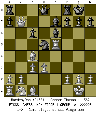 Last move : 1-0 2009 March 1 17:52:10 [Event "FICGS__CHESS__WCH_STAGE_1_GROUP_10__000006"] [Site "FICGS"] [Date "2009.02.03"] [Round "1"] [White "Burden,Don"] [Black "Connor,Thomas"] [Result "1-0"] [WhiteElo "2132"] [BlackElo "1156"] 1.e4 e5 2.Nf3 Nc6 3.Bc4 Bc5 4.c3 Nf6 5.d3 O-O 6.O-O Be7 7.Re1 d5 8.exd5 Nxd5 9.Nxe5 Nxe5 10.Rxe5 Be6 11.Qb3 c6 12.Qxb7 1-0 Giuoco Piano Kingside Castling by player Black (move 5) Kingside Castling by player White (move 6) Player White won this chess game. Follow this game move after move (download)Don't even mention losing to me. I can't stand to think of it. (Bobby Fischer) Ich glaube, ich kenne inzwischen die Gründe für mein Versagen: schachliche Charakterfehler. Ich war nie ein Wunderkind und in meiner gesamten menschlichen Entwicklung immer zu langsam. (Viktor Kortschnoi) Si el ingenio solamente fuese necesario para lucirse, las mujeres serían las mejores jugadoras de Ajedrez del mundo. (Albin) Le profane ne songe pas à la somme de jouissance dont il se prive, qui méconnaît ce jeu aux ressources aussi variées que passionnantes. (Jean-Marie Jeanton-Lamarche) It is not titles that honor men, but men that honor titles. (Niccolo Machiavelli)