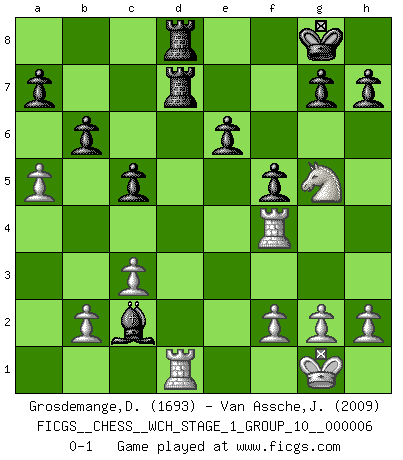 Last move : 0-1 2009 April 22 21:24:27 [Event "FICGS__CHESS__WCH_STAGE_1_GROUP_10__000006"] [Site "FICGS"] [Date "2009.02.03"] [Round "1"] [White "Grosdemange,David"] [Black "Van Assche,Jeroen"] [Result "0-1"] [WhiteElo "1693"] [BlackElo "2009"] 1.e4 c5 2.Ne2 Nf6 3.Nbc3 d5 4.exd5 Nxd5 5.Nxd5 Qxd5 6.Nc3 Qe5+ 7.Qe2 Qxe2+ 8.Bxe2 Nc6 9.O-O Nd4 10.Bd1 e6 11.d3 Be7 12.Ne4 O-O 13.c3 Nf5 14.Bf4 Bd7 15.Re1 Bb5 16.Bc2 Rfd8 17.Rad1 Rd7 18.a4 Ba6 19.Bg5 b6 20.Bxe7 Nxe7 21.a5 Rad8 22.Re3 Nd5 23.Rg3 f5 24.Ng5 Nf4 25.Rf3 Bxd3 26.Rxf4 Bxc2 0-1 Sicilian : Keres variation (2.Ne2) Kingside Castling by player White (move 9) Kingside Castling by player Black (move 12) Player Black won this chess game. Follow this game move after move (download)Methodical thinking is of more use in Chess than inspiration. (C. J. S. Purdy) Ein Schachspiel besteht aus drei Phasen: Die erste, wenn du hofftst den Vorteil zu haben, die zweite, wenn du glaubst einen Vorteil zu haben, und die dritte.... wenn du weißt Du wirst verlieren. (Savielly Grigorievitsch Tartakower) El Ajedrez se juega con la mente... ¡no con las manos!. (Renaud y Kahn) Vouloir jouer aux échecs contre soi-même est aussi paradoxal que vouloir marcher sur son ombre. (Stefan Zweig) Who needs drugs and alcohol if he can play Big Chess at FICGS ? (Heinz-Georg Lehnhoff)