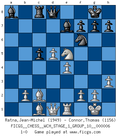 Last move : 1-0 2009 April 12 14:46:22 [Event "FICGS__CHESS__WCH_STAGE_1_GROUP_10__000006"] [Site "FICGS"] [Date "2009.02.03"] [Round "1"] [White "Ratna,Jean-Michel"] [Black "Connor,Thomas"] [Result "1-0"] [WhiteElo "1949"] [BlackElo "1156"] 1.e4 e5 2.Nf3 Nc6 3.Bb5 a6 4.Ba4 Nf6 5.O-O Be7 6.Re1 b5 7.Bb3 d6 8.c3 O-O 9.h3 Na5 10.Bc2 c5 11.d4 exd4 12.cxd4 Nc6 13.Nc3 Bb7 14.d5 Ne5 15.Nxe5 dxe5 16.a4 Qc7 17.axb5 axb5 18.Nxb5 Qb6 19.Na3 Rfc8 20.Nc4 Qd8 21.Rxa8 Bxa8 22.Nxe5 1-0 Ruy Lopez : Closed Kingside Castling by player White (move 5) Kingside Castling by player Black (move 8) Player White won this chess game. Follow this game move after move (download)I like the moment when I break a man's ego. (Bobby Fischer) Ich habe Putins Aufstieg an die Macht beobachtet und seine Politik, die demokratischen Institutionen meines Landes zu zerstören. (Garry Kasparov) De eso se trata el Ajedrez. Un día le das una lección a tu oponente y al día siguiente el te da una a tí. (Bobby Fischer) La vie est comme un jeu d'échecs : nous esquissons un plan, mais celui-ci est tributaire de ce que daignent faire l'adversaire aux échecs et le destin dans la vie. (Arthur Schopenhauer) All battles are fought by scared men who'd rather be someplace else. (John Wayne in the movie In harm's way)