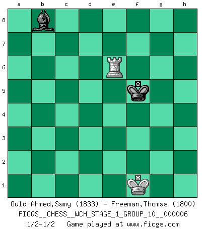 Last move : 1/2-1/2 2009 September 14 14:45:36 [Event "FICGS__CHESS__WCH_STAGE_1_GROUP_10__000006"] [Site "FICGS"] [Date "2009.02.03"] [Round "1"] [White "Ould Ahmed,Samy"] [Black "Freeman,Thomas"] [Result "1/2-1/2"] [WhiteElo "1833"] [BlackElo "1800"] 1.e4 c5 2.Nf3 d6 3.d4 cxd4 4.Nxd4 Nf6 5.Nc3 Nc6 6.Bg5 g6 7.Bxf6 exf6 8.Bc4 Bg7 9.Ndb5 O-O 10.Qxd6 f5 11.O-O-O Qa5 12.Qc7 fxe4 13.Qxa5 Nxa5 14.Bd5 Bg4 15.Rde1 a6 16.Nd6 e3 17.f3 Be6 18.Bxe6 fxe6 19.Nde4 Nc4 20.h4 Rac8 21.Nd1 Bh6 22.Re2 Rfd8 23.Rhe1 Ne5 24.Kb1 Nc4 25.Nf6+ Kg7 26.Ng4 Bf4 27.Ngxe3 Nd2+ 28.Kc1 Nc4 29.b3 Ne5 30.Kb1 Nc6 31.c3 Ne5 32.Rh1 b5 33.Nc2 Kf7 34.Nf2 Nd3 35.Ne4 Nc5 36.Rf1 h6 37.Nb4 Bd6 38.Re3 Bf4 39.R3e1 a5 40.Nc2 Bd2 41.Re2 Nxe4 42.fxe4 Kg8 43.Nd4 Bxc3 44.Nxb5 Bg7 45.Rc1 Rxc1+ 46.Kxc1 Bf6 47.Na7 Bxh4 48.Nc6 Ra8 49.Rc2 h5 50.Kd2 Bg3 51.Ke3 h4 52.e5 Kh7 53.Ke4 Rf8 54.Nxa5 g5 55.Nc6 Rf4+ 56.Ke3 Rf5 57.b4 g4 58.a4 h3 59.gxh3 gxh3 60.Nd4 Rf1 61.Nf3 Kg6 62.b5 Ra1 63.b6 Ra3+ 64.Ke2 h2 65.Rc1 Bf4 66.Rh1 Re3+ 67.Kf2 Rb3 68.a5 Rb2+ 69.Kf1 Kf5 70.Nxh2 Ke4 71.Ng4 Kf3 72.Rh3+ Kxg4 73.Ra3 Bxe5 74.a6 Rxb6 75.a7 Rb8 76.axb8Q Bxb8 77.Re3 Kf5 78.Rxe6 1/2-1/2 Sicilian : Richter-Rauzer, Bondarevsky variation Kingside Castling by player Black (move 9) Queenside Castling by player White (move 11) 10 pieces endgame at move 70 : White KRNPPP , Black KRBP WHITE : King + 1 Rook 1 Knight 3 Pawns BLACK : King + 1 Rook 1 Bishop 1 Pawn 9 pieces endgame at move 72 : White KRPPP , Black KRBP WHITE : King + 1 Rook 3 Pawns BLACK : King + 1 Rook 1 Bishop 1 Pawn 8 pieces endgame at move 73 : White KRPP , Black KRBP WHITE : King + 1 Rook 2 Pawns BLACK : King + 1 Rook 1 Bishop 1 Pawn 7 pieces endgame at move 74 : White KRP , Black KRBP WHITE : King + 1 Rook 1 Pawn BLACK : King + 1 Rook 1 Bishop 1 Pawn Promotion Queen by player White (move 76) 6 pieces endgame at move 76 : White KQR , Black KBP WHITE : King + 1 Queen 1 Rook BLACK : King + 1 Bishop 1 Pawn 5 pieces endgame at move 76 : White KR , Black KBP WHITE : King + 1 Rook BLACK : King + 1 Bishop 1 Pawn 4 pieces endgame at move 78 : White KR , Black KB WHITE : King + 1 Rook BLACK : King + 1 Bishop This chess game ended in a draw. Follow this game move after move (download)What is the difference between chess and football? Everybody understands football, but nobody plays it. Everybody plays chess, but nobody understands it. Everything is relative. (Vladimir Kramnik) Man wirke der falschen Auffassung entgegen, als ob jeder Zug Unmittelbares zu leisten habe; auch Werte- und Ruhezüge haben ihre Existenzberechtigung. (Aaron Nimzowitsch) Del Ajedrez se ha dicho que la vida no es lo suficientemente larga para él, pero eso es culpa de la vida, no del Ajedrez. (William Ewart Napier) Aidez vos pièces, elles vous aideront. (Paul Morphy) However beautiful the strategy, you should occasionally look at the results. (Winston Churchill)