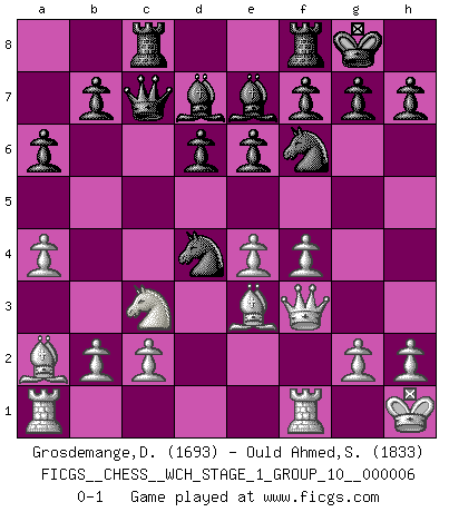 Last move : 0-1 2009 May 6 17:8:49 [Event "FICGS__CHESS__WCH_STAGE_1_GROUP_10__000006"] [Site "FICGS"] [Date "2009.02.03"] [Round "1"] [White "Grosdemange,David"] [Black "Ould Ahmed,Samy"] [Result "0-1"] [WhiteElo "1693"] [BlackElo "1833"] 1.e4 c5 2.Ne2 d6 3.d4 cxd4 4.Nxd4 Nf6 5.Nc3 a6 6.Bc4 e6 7.O-O Be7 8.a4 O-O 9.Ba2 Nc6 10.Be3 Qc7 11.Kh1 Bd7 12.f4 Rac8 13.Qf3 Nxd4 0-1 This chess game has been lost on time (started : 2009.02.03 12:52:11) Sicilian : Keres variation (2.Ne2) Kingside Castling by player White (move 7) Kingside Castling by player Black (move 8) Player Black won this chess game. Follow this game move after move (download)Chess holds its master in its own bonds, shackling the mind and brain so that the inner freedom of the very strongest must suffer. (Albert Einstein) Rubinstein ist ein Turmendspiel, welches die Götter vor tausenden von Jahren begannen. (Savielly Grigorievitsch Tartakower) No hay un Gran Maestro de Ajedrez que sea normal; solo se diferencían ellos por la magnitud de su locura. (Viktor Korchnoi) Le jeu d'échecs est comme rejeté hors du temps. (Antoine de Saint-Exupéry) Either move or be moved. (Ezra Pound)