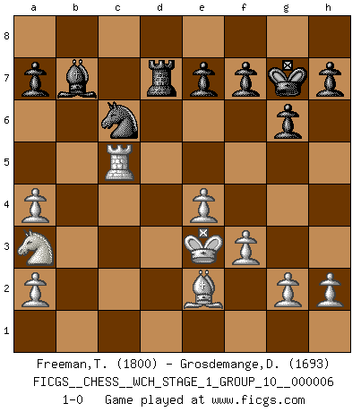 Last move : 1-0 2009 May 15 6:4:23 [Event "FICGS__CHESS__WCH_STAGE_1_GROUP_10__000006"] [Site "FICGS"] [Date "2009.02.03"] [Round "1"] [White "Freeman,Thomas"] [Black "Grosdemange,David"] [Result "1-0"] [WhiteElo "1800"] [BlackElo "1693"] 1.e4 c5 2.Nf3 Nc6 3.d4 cxd4 4.Nxd4 g6 5.Be3 Bg7 6.c4 Nf6 7.Nc3 Ng4 8.Qxg4 Nxd4 9.Qd1 Ne6 10.Qd2 Qa5 11.Rc1 b6 12.Qd5 Rb8 13.Qxa5 bxa5 14.b3 Bd4 15.Bxd4 Nxd4 16.Nb5 Nc6 17.Be2 Bb7 18.f3 O-O 19.Kf2 d6 20.c5 dxc5 21.Rxc5 Rfd8 22.Ke3 Kg7 23.Rd1 Rxd1 24.Bxd1 Rd8 25.Be2 Rd7 26.Na3 a4 27.bxa4 1-0 This chess game has been lost on time (started : 2009.02.03 12:52:11) Sicilian defense Kingside Castling by player Black (move 18) Player White won this chess game. Follow this game move after move (download)We must make sure that Chess will not be like a dead language, very interesting, but for a very small group. (Sytze Faber) Ein guter Spieler hat immer Glück. (José Raúl Capablanca) Con el tiempo, empecé a progresar en partidas decisivas. Tal vez porque me di cuenta de una simple verdad: no solo estaba yo nervioso sino también mi oponente. (Mikhail Tal) Des points faibles ou des trous dans la position de l'adversaire doivent être occupés par des pièces et non pas par des pions. (Siegbert Tarrasch) Memory is a way of holding onto the things you love, the things you are, the things you never want to lose. (from the television show: The Wonder Years)