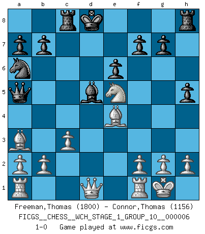 Last move : 1-0 2009 April 3 20:48:27 [Event "FICGS__CHESS__WCH_STAGE_1_GROUP_10__000006"] [Site "FICGS"] [Date "2009.02.03"] [Round "1"] [White "Freeman,Thomas"] [Black "Connor,Thomas"] [Result "1-0"] [WhiteElo "1800"] [BlackElo "1156"] 1.e4 d5 2.exd5 Qxd5 3.Nc3 Qa5 4.Bc4 e6 5.d3 Nf6 6.Bd2 Bd7 7.Nf3 Be7 8.Nd5 Qc5 9.Bb4 Qc6 10.Nxe7 Qb6 11.Ba3 c5 12.d4 Qa5+ 13.c3 Kxe7 14.Bxc5+ Kd8 15.O-O Na6 16.Bd6 Ne4 17.Ba3 Rc8 18.Bd3 Bc6 19.Ne5 h5 20.d5 Bxd5 21.Bxe4 1-0 Scandinavian (centre counter) defense Kingside Castling by player White (move 15) Player White won this chess game. Follow this game move after move (download)One bad move nullifies forty good ones. (Horowitz) Frage des Reporters: -Welche besonderen Umstände rechtfertigen das Anhalten der Uhren während einer Turnierpartie? Antwort: -Einen Fotographen zu strangulieren. (Siegbert Tarrasch) La captura del Rey enemigo es la finalidad pero no el primer objetivo de la partida. (William Steinitz) Toutes les manuvres exécutées sur une colonne ouverte ont pour but ultime l'intrusion définitive sur la septième ou la huitième rangée, en plein cur de la position ennemie. (Aaron Nimzovitch) It is the aim of the modern school, not to treat every position according to one general law, but according to the principle inherent in the position. (Richard Reti)