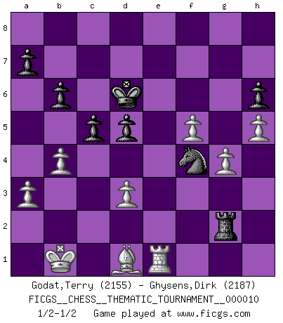 Last move : 1/2-1/2 2006 October 14 21:35:33 [Event "FICGS__CHESS__THEMATIC_TOURNAMENT__000010"] [Site "FICGS"] [Date "2006.08.28"] [Round "1"] [White "Godat,Terry"] [Black "Ghysens,Dirk"] [Result "1/2-1/2"] [WhiteElo "2155"] [BlackElo "2187"] 1.e4 e5 2.Nf3 f5 3.Bc4 fxe4 4.Nxe5 d5 5.Qh5+ g6 6.Nxg6 Nf6 7.Qe5+ Be7 8.Bb5+ c6 9.Nxe7 Qxe7 10.Qxe7+ Kxe7 11.Bf1 Rg8 12.d4 exd3 13.cxd3 c5 14.Nc3 Nc6 15.h4 Nb4 16.Bg5 h6 17.Bxf6+ Kxf6 18.Kd2 Be6 19.g3 Ke7 20.a3 Nc6 21.Re1 Kd6 22.Nb5+ Kd7 23.Rxe6 Kxe6 24.Nc7+ Kd6 25.Nxa8 Rxa8 26.Be2 Rg8 27.Rg1 Nd4 28.f4 Nb3+ 29.Kd1 Nd4 30.g4 Rf8 31.Rf1 Re8 32.Rf2 Re3 33.Kd2 Rh3 34.h5 Rg3 35.Bd1 b6 36.Rf1 Rg2+ 37.Kc1 Rg3 38.Re1 Ne6 39.f5 Nf4 40.Kb1 Rg2 41.b4 1/2-1/2 Latvian : Polerio variation This chess game ended in a draw. Follow this game move after move (download)Many have become Chess Masters, no one has become the Master of Chess. (Siegbert Tarrasch) Ohne Leiden bildet sich kein Charakter. (Ernst Freiherr von Feuchtersleben) Nunca antes ha habido un jugador de Ajedrez con tal conocimiento a fondo de las complejidades del juego y una inmensa voluntad absolutamente indomable de ganar. Yo pienso que Fischer es el jugador mas grande que jamás haya existido. (Lisa Lane) Des points faibles ou des trous dans la position de l'adversaire doivent être occupés par des pièces et non pas par des pions. (Siegbert Tarrasch) The leaves of memory seemed to make a mournful rustling in the dark. (Henry Wadsworth Longfellow)