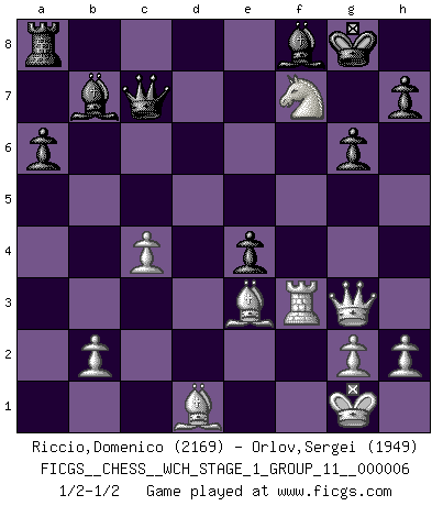 Last move : 1/2-1/2 2009 May 23 8:22:50 [Event "FICGS__CHESS__WCH_STAGE_1_GROUP_11__000006"] [Site "FICGS"] [Date "2009.02.03"] [Round "1"] [White "Riccio,Domenico"] [Black "Orlov,Vladimir"] [Result "1/2-1/2"] [WhiteElo "2169"] [BlackElo "1949"] 1.e4 e6 2.d4 d5 3.Nc3 Nf6 4.e5 Nfd7 5.f4 c5 6.Nf3 Nc6 7.Be3 a6 8.Be2 Qc7 9.O-O Be7 10.Qd2 O-O 11.dxc5 Nxc5 12.Rad1 b5 13.a3 Bb7 14.Qe1 Ne4 15.Nxe4 dxe4 16.Nd2 Rfd8 17.c3 Nb8 18.c4 b4 19.axb4 Bxb4 20.Qf2 Nd7 21.Nb3 Bf8 22.Nd4 Nc5 23.f5 exf5 24.Nxf5 Rxd1 25.Bxd1 Nd3 26.Qg3 g6 27.Nd6 Nxe5 28.Nxf7 Nf3+ 29.Rxf3 1/2-1/2 French : Steinitz, Boleslavsky variation Kingside Castling by player White (move 9) Kingside Castling by player Black (move 10) This chess game ended in a draw. Follow this game move after move (download)There are two types of sacrifices: correct ones and mine. (Mikhail Tal) Wie bekannt hörte Morphy 1859 auf, Schach zu spielen. Seine Enttäuschung galt nicht so sehr dem Schach, wie den Schachspielern. (Robert James Fischer) El Ajedrez no es como la vida... ¡tiene reglas!. (Mark Pasternak) Je fais ceci parce que dans cinquante coups j'obtiendrai cela; je m'appelle Mikhail Moisevitch Botvinnik. (Botvinnik) A mistake is only a mistake if you let it happen twice. Otherwise it is a learning experience. (Daniel Parmet)