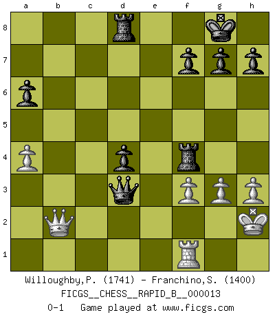 Last move : 0-1 2006 September 27 10:7:37 [Event "FICGS__CHESS__RAPID_B__000013"] [Site "FICGS"] [Date "2006.08.28"] [Round "1"] [White "Willoughby,Peter"] [Black "Franchino,Sebastian"] [Result "0-1"] [WhiteElo "1741"] [BlackElo "1400"] 1.e4 e5 2.Nf3 Nc6 3.Bb5 d6 4.O-O Bg4 5.h3 Bxf3 6.Qxf3 Nf6 7.c3 Qd7 8.d4 a6 9.Bxc6 bxc6 10.Bg5 Be7 11.Nd2 O-O 12.dxe5 dxe5 13.Rad1 Qe6 14.a3 Rfb8 15.b4 c5 16.Qd3 cxb4 17.Bxf6 Qxf6 18.cxb4 c5 19.bxc5 Bxc5 20.Nf3 Re8 21.a4 Rac8 22.Qb3 Bd4 23.Nxd4 exd4 24.Qb2 Rxe4 25.f3 Rf4 26.Rd3 Rd8 27.g3 Qg6 28.Kh2 Qxd3 0-1 Comment by player 1 : Peter Willoughby : well played Ruy Lopez : Old Steinitz defense Kingside Castling by player White (move 4) Kingside Castling by player Black (move 11) Player Black won this chess game. Follow this game move after move (download)Chess, like love, like music, has the power to make people happy. (Siegbert Tarrasch) Man braucht nicht immer den besten Zug zu spielen: Ein Zug muß aktiv, unternehmungslustig, korrekt und schön sein. (David Bronstein) Una partida de Ajedrez se divide en 3 etapas: la primera cuando piensas que tienes la ventaja, la segunda cuando crees que tienes la ventaja y la tercera... ¡cuando te das cuenta que vas a perder!. (Savielly Tartakower) Karpov est une pièce de musée. (Garry Kasparov) How many people work in NATO Headquarters ? - About half of them. (Dirk Stikker, NATO general secretary)