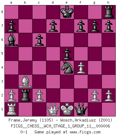 Last move : 0-1 2009 March 17 17:58:34 [Event "FICGS__CHESS__WCH_STAGE_1_GROUP_11__000006"] [Site "FICGS"] [Date "2009.02.03"] [Round "1"] [White "Frame,Jeremy"] [Black "Wosch,Arkadiusz"] [Result "0-1"] [WhiteElo "1105"] [BlackElo "2001"] 1.e4 c5 2.Nf3 Nc6 3.d4 cxd4 4.Nxd4 Nf6 5.Nxc6 bxc6 6.Nc3 e5 7.Bd3 Be7 8.Bg5 Rb8 9.Bc4 Rxb2 10.Bb3 Bb4 11.Bd2 Qa5 12.O-O Bxc3 13.Bxc3 Qxc3 14.f4 Nxe4 15.Rf3 Qc5+ 16.Kf1 Ba6+ 17.Ke1 Qg1+ 18.Rf1 Qxf1+ 0-1 Sicilian defense Kingside Castling by player White (move 12) Player Black won this chess game. Follow this game move after move (download)Why must I lose to this idiot ? (Aron Nimzovich) Man wirke der falschen Auffassung entgegen, als ob jeder Zug Unmittelbares zu leisten habe; auch Werte- und Ruhezüge haben ihre Existenzberechtigung. (Aaron Nimzowitsch) En el Ajedrez, cuando menos, el valiente hereda la tierra. (Edmar Mednis) Un footballeur joue avec ses pieds, parfois avec sa tête. Un joueur d'échecs ne joue qu'avec sa tête. Et quand il ne joue plus, il meurt. (Jacob Murray) Ah, beer! The cause of, and the solution to, all of life's problems. (Homer Simpson)