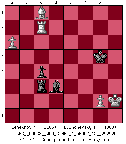 Last move : 1/2-1/2 2009 April 15 10:45:10 [Event "FICGS__CHESS__WCH_STAGE_1_GROUP_12__000006"] [Site "FICGS"] [Date "2009.02.03"] [Round "1"] [White "Lemekhov,Yura"] [Black "Blinchevsky,Alexander"] [Result "1/2-1/2"] [WhiteElo "2166"] [BlackElo "1969"] 1.d4 d5 2.c4 c6 3.Nf3 Nf6 4.Nc3 e6 5.Bg5 h6 6.Bh4 dxc4 7.e4 g5 8.Bg3 b5 9.Be2 Bb7 10.h4 g4 11.Ne5 h5 12.O-O Nbd7 13.Qc2 Nxe5 14.Bxe5 Bg7 15.Rad1 O-O 16.Bg3 Nd7 17.f3 Qb6 18.Kh1 c5 19.d5 Ne5 20.fxg4 hxg4 21.Bxe5 Bxe5 22.Bxg4 Rad8 23.dxe6 Rxd1 24.Rxd1 fxe6 25.Qd2 Rf4 26.Bh3 Kf7 27.h5 Qc7 28.Nxb5 Qe7 29.Nd6+ Bxd6 30.Qxd6 Qxd6 31.Rxd6 Bxe4 32.Rxe6 Bd3 33.Ra6 Rf2 34.Rxa7+ Kf6 35.Rb7 Kg5 36.a4 Kxh5 37.a5 Kg5 38.Kh2 c3 39.bxc3 Ra2 40.Ra7 Ra3 41.Bc8 Rxc3 42.Rc7 c4 43.a6 1/2-1/2 QGD Slav : 4.Nc3 Kingside Castling by player White (move 12) Kingside Castling by player Black (move 15) 10 pieces endgame at move 39 : White KRBPPP , Black KRBP WHITE : King + 1 Rook 1 Bishop 3 Pawns BLACK : King + 1 Rook 1 Bishop 1 Pawn 9 pieces endgame at move 41 : White KRBPP , Black KRBP WHITE : King + 1 Rook 1 Bishop 2 Pawns BLACK : King + 1 Rook 1 Bishop 1 Pawn This chess game ended in a draw. Follow this game move after move (download)No one ever won a game by resigning. (Unknown) Ich verachte Kasparow. (Viktor Kortschnoi) El juego de Fischer siempre fue nítido, racional y brillante. Uno de los mejores por siempre. (Dave Regis) Ce qui caractérise les parties de combat, c'est que si le défenseur a constamment de difficiles problèmes à résoudre, l'attaquant doit chercher sans relâche de nouvelles possibilités d'attaque. (Koblentz) Waiting for chance ? Play in casinos. (FICGS proverb)