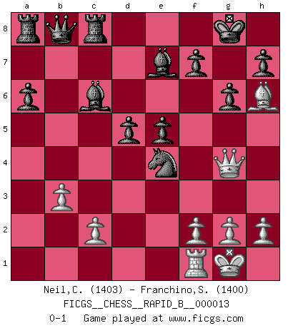 Last move : 0-1 2006 October 19 19:31:8 [Event "FICGS__CHESS__RAPID_B__000013"] [Site "FICGS"] [Date "2006.08.28"] [Round "1"] [White "Neil,Charlie"] [Black "Franchino,Sebastian"] [Result "0-1"] [WhiteElo "1403"] [BlackElo "1400"] 1.e4 e5 2.Nf3 Nc6 3.Bb5 d6 4.d4 Nf6 5.d5 a6 6.Bxc6+ bxc6 7.Nc3 cxd5 8.exd5 Be7 9.O-O O-O 10.Qd3 Bb7 11.Be3 c6 12.dxc6 Bxc6 13.Qd2 Qb8 14.b3 Rc8 15.Nh4 d5 16.Nf5 Bb4 17.a3 Ne4 18.Qe2 Bxc3 19.Qg4 g6 20.Bh6 Bxa1 21.Ne7+ Kh8 22.Nf5 Bb2 23.Bg7+ Kg8 24.Bh6 Bxa3 25.Ne7+ Bxe7 0-1 Ruy Lopez : Old Steinitz defense Kingside Castling by player White (move 9) Kingside Castling by player Black (move 9) Player Black won this chess game. Follow this game move after move (download)Chess is above all, a fight ! (Emanuel Lasker) Ich suche im Schach immer etwas Eigenes. Riskantes Spiel im Stile schachlicher Musketiere ist nicht meine Sache, auch wenn es vielen Freunden scharfer Wendungen gefällt. (Anatoly Karpov) Los Peones son nacidos libres, y aún así, se encuentran encadenados por todos lados. (Rick Kennedy) Ce qui caractérise les parties de combat, c'est que si le défenseur a constamment de difficiles problèmes à résoudre, l'attaquant doit chercher sans relâche de nouvelles possibilités d'attaque. (Koblentz) Big Chess is a place for big hallucinations. (Thibault de Vassal)