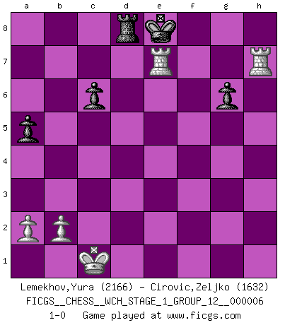 Last move : 1-0 2009 April 4 9:10:51 [Event "FICGS__CHESS__WCH_STAGE_1_GROUP_12__000006"] [Site "FICGS"] [Date "2009.02.03"] [Round "1"] [White "Lemekhov,Yura"] [Black "Cirovic,Zeljko"] [Result "1-0"] [WhiteElo "2166"] [BlackElo "1632"] 1.d4 d6 2.e4 g6 3.Nc3 Bg7 4.f4 Nf6 5.Nf3 O-O 6.Bd3 Bg4 7.h3 Bxf3 8.Qxf3 c6 9.Be3 Nbd7 10.e5 dxe5 11.dxe5 Ne8 12.h4 Bxe5 13.fxe5 Nxe5 14.Qe2 Nxd3+ 15.Qxd3 Qxd3 16.cxd3 Nd6 17.h5 b5 18.Kd2 a5 19.Rae1 Nf5 20.Bf2 Rfd8 21.hxg6 fxg6 22.g4 b4 23.gxf5 bxc3+ 24.Kxc3 Rd7 25.fxg6 hxg6 26.Bd4 Rad8 27.Rh8+ Kf7 28.Rh7+ Ke8 29.Bc5 Rxd3+ 30.Kc2 Rd2+ 31.Kc1 R2d7 32.Bxe7 Rxe7 33.R1xe7+ 1-0 Queen's Pawn Kingside Castling by player Black (move 5) 10 pieces endgame at move 33 : White KRRPP , Black KRPPP WHITE : King + 2 Rooks 2 Pawns BLACK : King + 1 Rook 3 Pawns Player White won this chess game. Follow this game move after move (download)No price is too great for the scalp of the enemy King. (Koblentz) Zum Sieg gelangt man nicht, wenn man gut, sondern nur wenn man besser spielt (Savielly Grigorievitsch Tartakower) Un jugador que trata de regresar una movida en el Ajedrez es un futuro carterista. (Richard Fenton) La vérité est comme le meilleur coup aux échecs : elle existe, mais il faut la chercher. (Arturo Perez-Reverte) The right perception of any matter and a misunderstanding of the same matter do not wholly exclude each other. (Kafka's the trial)