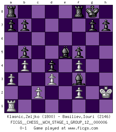 Last move : 0-1 2009 February 22 21:1:50 [Event "FICGS__CHESS__WCH_STAGE_1_GROUP_12__000006"] [Site "FICGS"] [Date "2009.02.03"] [Round "1"] [White "Klasnic,Zeljko"] [Black "Basiliev,Iouri"] [Result "0-1"] [WhiteElo "1800"] [BlackElo "2146"] 1.b3 e5 2.Bb2 Nc6 3.e4 Nf6 4.Bb5 Bc5 5.d3 Nd4 6.Bxd4 exd4 7.Nd2 c6 8.Ngf3 cxb5 9.O-O d6 10.a3 O-O 11.b4 Bb6 12.h3 Nh5 13.Ne1 Nf4 14.Nef3 Qf6 15.Nb3 Bxh3 16.g3 Ng6 17.Re1 Bg4 18.Nbd2 Ne5 19.Qc1 Nxf3+ 20.Nxf3 Bxf3 21.Qf4 Qxf4 22.gxf4 f5 23.e5 dxe5 24.Rxe5 Bc7 25.Kh2 Bxe5 0-1 Nimzovich-Larsen attack : Modern variation Kingside Castling by player White (move 9) Kingside Castling by player Black (move 10) Player Black won this chess game. Follow this game move after move (download)He who takes the Queen's Knight's Pawn will sleep in the streets. (Anonymous) Deine Wertungszahl - vorausgesetzt einige Jahre schachliche Anstrengung - entspricht etwa dem zehnfachen Deines IQ plus 1000. (Jonathan Levitt) Por tratar de evitar la pérdida de una pieza, muchas personas han perdido una partida de Ajedrez. (Savielly Tartakover) Horreur, mais aussi harmonie suprême : qu'y avait-il en effet au monde en dehors des échecs ? Le brouillard, l'inconnu, le non-être... (Vladimir Nabokov) War is the child of passion, passion is the child of narcissism and narcissism is the child. (...) Another game ? (Thibault de Vassal)
