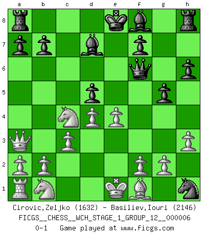 Last move : 0-1 2009 February 10 21:30:45 [Event "FICGS__CHESS__WCH_STAGE_1_GROUP_12__000006"] [Site "FICGS"] [Date "2009.02.03"] [Round "1"] [White "Cirovic,Zeljko"] [Black "Basiliev,Iouri"] [Result "0-1"] [WhiteElo "1632"] [BlackElo "2146"] 1.e4 c5 2.Nf3 d6 3.c3 Nf6 4.d3 Nc6 5.h3 e5 6.Bg5 h6 7.Bh4 g5 8.Bg3 Nh5 9.Nxe5 Nxg3 10.Nxc6 Qb6 11.Qa4 Nxh1 12.Na5 Bd7 13.Qa3 c4 14.d4 d5 15.Nxc4 Qf6 0-1 Sicilian Player Black won this chess game. Follow this game move after move (download)In life, as in Chess, one's own Pawns block one's way. A man's very wealth, ease, leisure, children, books, which should help him to win, more often checkmate him. (Charles Buxton) Das Schachspiel hat wie die Liebe, die Musik, die Fähigkeit, den Menschen glücklich zu machen. Ich habe ein leises Gefühl des Bedauerns für jeden, der das Schachspiel nicht kennt, so wie ich jeden bedaure, der die Liebe nicht kennt. (Siegbert Tarrasch) Cuando tengas duda... ¡juega al Ajedrez!. (Tevis) J'apprécie les joueurs d'est-indienne, c'est grâce à eux que je nourris ma famille depuis tant d'années. (Petrosian) Fortune favours the audacious. (Desiderius Erasmus)