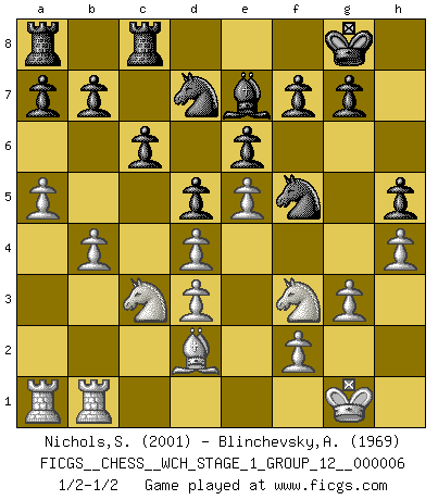 Last move : 1/2-1/2 2009 February 21 3:27:23 [Event "FICGS__CHESS__WCH_STAGE_1_GROUP_12__000006"] [Site "FICGS"] [Date "2009.02.03"] [Round "1"] [White "Nichols,Scott"] [Black "Blinchevsky,Alexander"] [Result "1/2-1/2"] [WhiteElo "2001"] [BlackElo "1969"] 1.e4 c6 2.d4 d5 3.e5 Bf5 4.Nf3 e6 5.Bd3 Bxd3 6.Qxd3 Qa5+ 7.Bd2 Qa6 8.O-O Qxd3 9.cxd3 Nd7 10.h4 h5 11.Nc3 Ne7 12.b4 Nf5 13.Rfb1 Be7 14.g3 O-O 15.a4 Rfb8 16.a5 Rc8 1/2-1/2 Caro-Kann : Advance variation Kingside Castling by player White (move 8) Kingside Castling by player Black (move 14) This chess game ended in a draw. Follow this game move after move (download)Human affairs are like a Chess game: only those who do not take it seriously can be called good players. (Hung Tzu Ch'eng) Intelligenz läßt sich nicht am Weg, sondern nur am Ergebnis feststellen. (Garry Kasparov) Las piezas de Ajedrez son los bloques del alfabeto que moldean los pensamientos; y esos pensamientos, aunque hagan un diseño visual en el tablero, expresan abstractamente su belleza como un poema. (Marcel Duchamp) Tout change constamment, y compris dans le monde des Echecs. (Botvinnik) Thus, what is of supreme importance in war is to attack the enemy's strategy. (Sun Tzu)