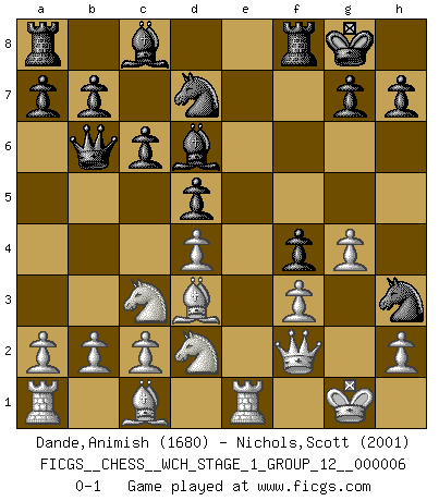 Last move : 0-1 2009 February 15 1:56:42 [Event "FICGS__CHESS__WCH_STAGE_1_GROUP_12__000006"] [Site "FICGS"] [Date "2009.02.03"] [Round "1"] [White "Dande,Animish"] [Black "Nichols,Scott"] [Result "0-1"] [WhiteElo "1680"] [BlackElo "2001"] 1.e4 e5 2.Nf3 Nf6 3.Nxe5 d6 4.Nf3 Nxe4 5.d4 d5 6.Bd3 f5 7.Qe2 Bd6 8.Nc3 c6 9.Nd2 O-O 10.O-O Qc7 11.g3 Nd7 12.f3 Ng5 13.Re1 f4 14.g4 Qb6 15.Qf2 Nh3+ 0-1 Petrov : Classical attack Kingside Castling by player Black (move 9) Kingside Castling by player White (move 10) Player Black won this chess game. Follow this game move after move (download)I play correspondence chess because it is both art and science while chess is art only. (A player at FICGS) Ich würde die 30 stärksten Spieler der USA im Simultanspiel besiegen. (José Raúl Capablanca) El Ajedrez es una hermosa aventura. (Bent Larsen) Les échecs c'est le défi de l'alpiniste, toujours plus haut, prêt à tout pour monter à l'assaut du Roi ennemi. Les échecs, c'est de la musique en mouvement, un ballet majestueux pour les yeux. C'est de la poésie composée par les fantômes du passé qui au même titre que Rimbaud ou Verlaine méritent notre admiration. Les échecs, c'est de la peinture ou le moindre mouvement modifie le tableau pour en faire un Picasso ou un Van Gogh. Les échecs, c'est tout et rien, c'est la vie et la mort. Jjulie33 sur le forum de France-Echecs. To err is human, to shift the blame on someone else is tactical. (Mladen Jankovic)