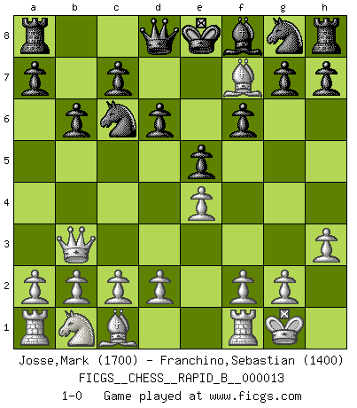 Last move : 1-0 2006 August 30 23:44:24 [Event "FICGS__CHESS__RAPID_B__000013"] [Site "FICGS"] [Date "2006.08.28"] [Round "1"] [White "Josse,Mark"] [Black "Franchino,Sebastian"] [Result "1-0"] [WhiteElo "1700"] [BlackElo "1400"] 1.e4 e5 2.Nf3 Nc6 3.Bc4 d6 4.O-O Bg4 5.h3 Bxf3 6.Qxf3 f6 7.Qb3 b6 8.Bf7+ 1-0 King's pawn game Kingside Castling by player White (move 4) Player White won this chess game. Follow this game move after move (download)When you play Bobby, it is not a question if you win or lose. It is a question if you survive. (Boris Spassky) Capablanka war das größte Genie der Schachgeschichte! Aber denken sie nicht er habe nichts vom Schach verstanden. Er wusste nur soviel wie er wissen musste um seine Ziele zu erreichen. (Mikhail Moiseyevich Botvinik) El Ajedrez es sobre todo, ¡una pelea!. (Emanuel Lasker) Il (Jacob Murray) ne joue pas pour le bon coup, mais pour le meilleur. (Eloi Relange) The intuitive mind is a sacred gift; the rational mind is a faithful servant. We have created a society that honors the servant but has forgotten the gift. (Albert Einstein)