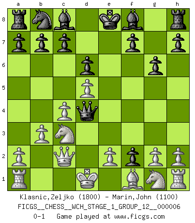 Last move : 0-1 2009 February 26 16:26:20 [Event "FICGS__CHESS__WCH_STAGE_1_GROUP_12__000006"] [Site "FICGS"] [Date "2009.02.03"] [Round "1"] [White "Klasnic,Zeljko"] [Black "Marin,John"] [Result "0-1"] [WhiteElo "1800"] [BlackElo "1100"] 1.b3 e5 2.Bb2 d6 3.d4 e4 4.d5 Nf6 5.c4 g6 6.Qc2 e3 7.Bxf6 exf2+ 8.Kd1 Qxf6 9.Nc3 Qd4+ 0-1 Nimzovich-Larsen attack : Modern variation Player Black won this chess game. Follow this game move after move (download)The passed pawn is a criminal, who should be kept under lock and key. Mild measures, such as police surveillance, are not sufficient. (Nimzovitch) Ich hatte meine größten Erfolge, als ich 47 Jahre alt war. Kasparow war noch nicht mal 42 und hat das Schach schon im Stich gelassen. (Viktor Kortschnoi) Fischer deseaba darle a los Rusos una sopa de su propia medicina. (Larry Evans) Mon pion favori sur ma case favorite ! Bronstein en parlant d'un coup de pion en h5 quand il avait les Noirs. The Internet is the first thing that humanity has build that humanity doesn't understand, the largest experiment in anarchy that we have ever had. (Eric Schmidt)