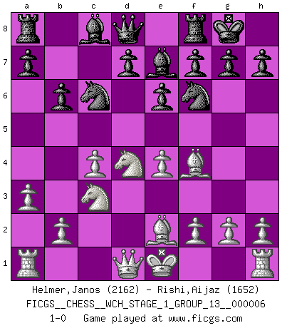 Last move : 1-0 2009 March 28 0:9:4 [Event "FICGS__CHESS__WCH_STAGE_1_GROUP_13__000006"] [Site "FICGS"] [Date "2009.02.03"] [Round "1"] [White "Helmer,Janos"] [Black "Rishi,Aijaz"] [Result "1-0"] [WhiteElo "2162"] [BlackElo "1652"] 1.Nf3 Nf6 2.c4 c5 3.d4 cxd4 4.Nxd4 Nc6 5.Nc3 e6 6.a3 Be7 7.e4 b6 8.Bf4 O-O 9.Be2 1-0 This chess game has been lost on time (started : 2009.02.03 13:1:5) Reti Opening Kingside Castling by player Black (move 8) Player White won this chess game. Follow this game move after move (download)Life is a kind of Chess, with struggle, competition, good and ill events. (Benjamin Franklin) Ein Kibitz ist einer, der deinem Gegner gute Ratschläge gibt. (Andrew Soltis) Aquellos que dicen que entienden al Ajedrez, no entienden nada. (Robert Hubner) Les Echecs représentent une sphère d'idées créatrices basée sur la volonté des deux protagonistes. (Smyslov) Once you start thinking you have nothing left to learn, you have everything to learn. (Steve Badget)