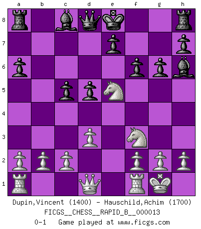 Last move : 0-1 2006 October 19 18:38:35 [Event "FICGS__CHESS__RAPID_B__000013"] [Site "FICGS"] [Date "2006.08.28"] [Round "1"] [White "Dupin,Vincent"] [Black "Hauschild,Achim"] [Result "0-1"] [WhiteElo "1400"] [BlackElo "1700"] 1.e4 c5 2.Nf3 Nc6 3.Bb5 a6 4.Bxc6 bxc6 5.d3 g6 6.Nbd2 Bg7 7.O-O Nh6 8.Nc4 d5 9.exd5 cxd5 10.Bxh6 Bxh6 11.Nce5 f6 0-1 This chess game has been lost on time (started : 2006.08.28 9:46:28) Sicilian : Nimzovich-Rossolimo attack (without ...d6) Kingside Castling by player White (move 7) Player Black won this chess game. Follow this game move after move (download)Chess, like love, is infectious at any age. (Flohr) Den Ruhm habe ich schon, jetzt brauche ich noch das Geld. (Wilhelm Steinitz) Hasta este punto, las blancas han seguido un análisis bien conocido. Pero ahora el hace un error fatal: empieza a usar su propia cabeza. (Siegbert Tarrasch) Je fais ceci parce que dans cinquante coups j'obtiendrai cela; je m'appelle Mikhail Moisevitch Botvinnik. (Botvinnik) If you lose the game you should win the analysis! (Proverb)