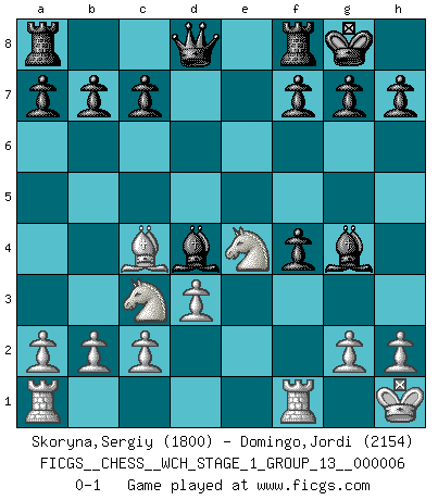 Last move : 0-1 2009 March 9 20:18:15 [Event "FICGS__CHESS__WCH_STAGE_1_GROUP_13__000006"] [Site "FICGS"] [Date "2009.02.03"] [Round "1"] [White "Skoryna,Sergiy"] [Black "Domingo,Jordi"] [Result "0-1"] [WhiteElo "1800"] [BlackElo "2154"] 1.e4 e5 2.Bc4 Nf6 3.d3 Nc6 4.Nf3 Bc5 5.Ng5 O-O 6.O-O d5 7.exd5 Bg4 8.Qd2 Nxd5 9.Nc3 Nf4 10.Nge4 Nd4 11.f3 Nxf3+ 12.Kh1 Nxd2 13.Bxd2 Bd4 14.Bxf4 exf4 0-1 Bishop's Opening : Berlin defense Kingside Castling by player Black (move 5) Kingside Castling by player White (move 6) Player Black won this chess game. Follow this game move after move (download)Not all artists are Chess players, but all Chess players are artists. (Marcel Duchamp) Ich glaube nicht an Psychologie, ich glaube an gute Züge. (Robert James Fischer) Bobby es la celebridad menos entendida y malinterpretada que camina el la faz de esta tierra. (Yasser Seirawan) La menace est plus forte que l'exécution. (Aaron Nimzovitch) Creativity is inventing, experimenting, growing, taking risks, breaking rules, making mistakes, and having fun. (Mary Lou Cook)