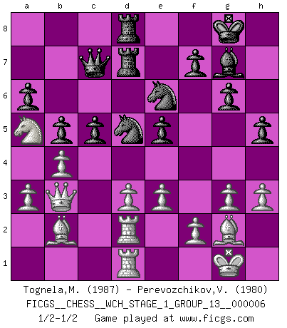 Last move : 1/2-1/2 2009 April 18 14:39:48 [Event "FICGS__CHESS__WCH_STAGE_1_GROUP_13__000006"] [Site "FICGS"] [Date "2009.02.03"] [Round "1"] [White "Tognela,Matteo"] [Black "Perevozchikov,Vjacheslav"] [Result "1/2-1/2"] [WhiteElo "1987"] [BlackElo "1980"] 1.Nf3 d5 2.g3 Nf6 3.Bg2 c6 4.c4 g6 5.b3 Bg7 6.Bb2 O-O 7.O-O Bg4 8.d3 Nbd7 9.Nbd2 Re8 10.h3 Bxf3 11.Nxf3 e5 12.cxd5 Nxd5 13.Qc2 Qe7 14.Nd2 Rad8 15.Nc4 Nf8 16.Rfe1 Qc7 17.a3 Ne6 18.e3 Nb6 19.Rad1 Rd7 20.Re2 Red8 21.Red2 Nd5 22.b4 b5 23.Na5 c5 24.Qb3 a6 25.Kh2 h5 26.Kg1 1/2-1/2 Reti : King's Indian attack (Barcza system) Kingside Castling by player Black (move 6) Kingside Castling by player White (move 7) This chess game ended in a draw. Follow this game move after move (download)Dazzling combinations are for the many, shifting wood is for the few. (Georg Kieninger) Wer nie einen Fehler gemacht hat, hat nie etwas Neues ausprobiert. (Albert Einstein) Las Aperturas te enseñan aperturas. ¡Los Finales te enseñan Ajedrez!. (Stephan Gerzadowicz) Horreur, mais aussi harmonie suprême : qu'y avait-il en effet au monde en dehors des échecs ? Le brouillard, l'inconnu, le non-être... (Vladimir Nabokov) You can only get smarter by playing a smarter opponent. (Revolver, movie)