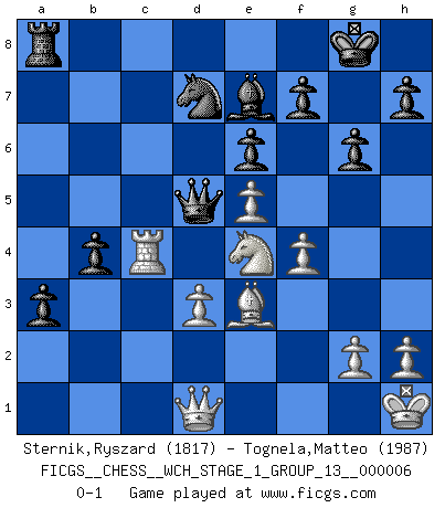 Last move : 0-1 2009 February 14 22:4:56 [Event "FICGS__CHESS__WCH_STAGE_1_GROUP_13__000006"] [Site "FICGS"] [Date "2009.02.03"] [Round "1"] [White "Sternik,Ryszard"] [Black "Tognela,Matteo"] [Result "0-1"] [WhiteElo "1817"] [BlackElo "1987"] 1.e4 d6 2.d4 Nf6 3.Nc3 g6 4.f4 Bg7 5.Nf3 O-O 6.Be2 c5 7.dxc5 Qa5 8.O-O Qxc5+ 9.Kh1 Nc6 10.Bd3 Bg4 11.Qe1 Bxf3 12.Rxf3 Nb4 13.Be3 Nxd3 14.cxd3 Qb4 15.Bg1 e6 16.e5 Nd7 17.a3 Qxb2 18.Rb1 Qxa3 19.Nb5 Qa2 20.Nxd6 b6 21.Nc4 Qa4 22.Bd4 Rfc8 23.Ra1 Qc6 24.Nd6 Rc7 25.Qe3 Bf8 26.Ne4 a5 27.R3f1 b5 28.Qd2 b4 29.Rfc1 Qb7 30.Rxc7 Qxc7 31.Qd1 Qc6 32.Rc1 Qd5 33.Be3 a4 34.Rc7 Be7 35.Rc4 a3 0-1 Pirc : Austrian attack Kingside Castling by player Black (move 5) Kingside Castling by player White (move 8) Player Black won this chess game. Follow this game move after move (download)My style is somewhere between that of Tal and Petrosian. (Reshevsky) Alle Schachspieler sollten auch ein Hobby haben. (Savielly Grigorievitsch Tartakower) El hombre es un frívolo, una creatura engañosa y como un jugador de Ajedrez, se preocupa mas por el proceso de obtener su meta que de la meta por sí misma. (Dostoyevsky) Si je n'étais pas joueur d'échecs, je serais le meilleur dans quelque chose d'autre. (Anatoli Karpov) Everybody lies. (Gregory House, House M.D.)