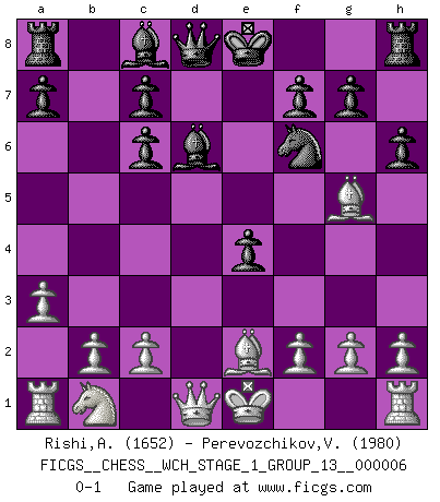Last move : 0-1 2009 March 31 1:37:23 [Event "FICGS__CHESS__WCH_STAGE_1_GROUP_13__000006"] [Site "FICGS"] [Date "2009.02.03"] [Round "1"] [White "Rishi,Aijaz"] [Black "Perevozchikov,Vjacheslav"] [Result "0-1"] [WhiteElo "1652"] [BlackElo "1980"] 1.e4 e5 2.Nf3 Nc6 3.d4 exd4 4.Nxd4 Nf6 5.Nxc6 bxc6 6.Bd3 d5 7.a3 dxe4 8.Be2 Bd6 9.Bg5 h6 0-1 This chess game has been lost on time (started : 2009.02.03 13:1:5) Scotch : Schmidt variation Player Black won this chess game. Follow this game move after move (download)A man without frontiers. He didn't divide the East and the West, he brought them together in their admiration for him. (Ljubomir Ljubojevic, about Bobby Fischer's death) Ich organisiere ein großes Turnier, was mich etwa 120000 Dollar kostet. Ich denke, das ist das erste Mal in der Schachgeschichte, daß ein Schachgroßmeister auch als Mäzen auftritt. (Miguel Najdorf) El tablero es el mundo, las piezas es el fenomeno del universo, las reglas del juego son lo que llamamos leyes de la naturaleza y el jugador del lado opuesto, se encuentra oculto a nuestra vista. (Thomas Huxley) J'ai toujours senti une vague pitié pour l'homme qui ne connaît rien aux échecs, tout comme j'en aurais pour un homme ignorant de l'amour. Les Echecs, comme la musique ou comme l'amour, ont le pouvoir de rendre heureux. (Siegbert Tarrasch) Life is like a ten-speed bicycle: most of us have gears we never use. (Charles M. Schulz)