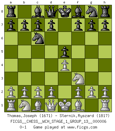 Last move : 0-1 2009 March 7 22:20:37 [Event "FICGS__CHESS__WCH_STAGE_1_GROUP_13__000006"] [Site "FICGS"] [Date "2009.02.03"] [Round "1"] [White "Thomas,Joseph"] [Black "Sternik,Ryszard"] [Result "0-1"] [WhiteElo "1671"] [BlackElo "1817"] 1.e4 e5 2.Nf3 Nc6 0-1 This chess game has been lost on time (started : 2009.02.03 13:1:5) King's pawn game Player Black won this chess game. Follow this game move after move (download)The way he plays Chess demonstrates a man's whole nature. (Stanley Ellin) Konzentriere dich auf materielle Gewinne. Nimm, was dir dein Gegner gibt, ausser es gibt einen guten Grund der dagegenspricht. (Robert James Fischer) Un mal plan es mejor que no tener ningún plan. (Frank Marshall) On n'a jamais que l'âge auquel on a commence à jouer aux échecs car après on cesse de vieillir. (Capablanca) The Internet isn't free. It just has an economy that makes no sense to capitalism. (Brad Shapcott)