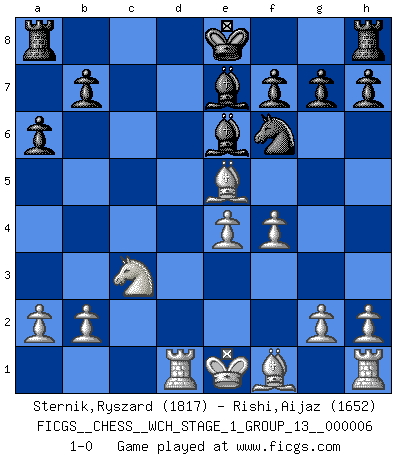 Last move : 1-0 2009 March 19 23:23:3 [Event "FICGS__CHESS__WCH_STAGE_1_GROUP_13__000006"] [Site "FICGS"] [Date "2009.02.03"] [Round "1"] [White "Sternik,Ryszard"] [Black "Rishi,Aijaz"] [Result "1-0"] [WhiteElo "1817"] [BlackElo "1652"] 1.e4 c5 2.Nf3 a6 3.c3 Nc6 4.d4 cxd4 5.cxd4 d6 6.Nc3 e6 7.d5 Ne5 8.dxe6 Bxe6 9.Bf4 Be7 10.Nxe5 dxe5 11.Bxe5 Qxd1+ 12.Rxd1 Nf6 13.f4 1-0 This chess game has been lost on time (started : 2009.02.03 13:1:5) Sicilian : O'Kelly variation Player White won this chess game. Follow this game move after move (download)Winning isn't everything... but losing is nothing. (Mednis) Das ganze Leben mit einer Ehefrau ist wie ein Endspiel mit ungleichfarbigen Läufern. (Viktor Kortschnoi) La partida mas dura de ganar es una partida ganada. (Emanuel Lasker) Mais l'homme est une créature légère et illogique : semblable au joueur d'échecs, il n'aime que le processus du but à atteindre, non le but lui-même. (Dostoïevsky) Any activity becomes creative when the doer cares about doing it right or doing it better. (John Updike)