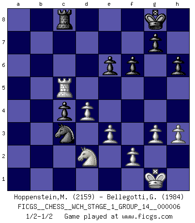 Last move : 1/2-1/2 2009 March 10 6:54:9 [Event "FICGS__CHESS__WCH_STAGE_1_GROUP_14__000006"] [Site "FICGS"] [Date "2009.02.03"] [Round "1"] [White "Hoppenstein,Michael"] [Black "Bellegotti,Giorgio"] [Result "1/2-1/2"] [WhiteElo "2159"] [BlackElo "1984"] 1.d4 Nf6 2.c4 e6 3.Nf3 d5 4.Nc3 c6 5.Bg5 h6 6.Bxf6 Qxf6 7.Qc2 dxc4 8.e3 b5 9.a4 Bb7 10.axb5 cxb5 11.Nxb5 Bb4+ 12.Nc3 O-O 13.Be2 Rc8 14.O-O Nd7 15.Nd2 Nb6 16.h3 Qe7 17.Rfc1 a5 18.Nf3 f6 19.Nh4 Bc6 20.Bf3 Bxf3 21.Nxf3 Nd5 22.Nd2 Qe8 23.Qa4 Qxa4 24.Rxa4 Rab8 25.g3 Bxc3 26.bxc3 Rb3 27.Rxa5 Rxc3 28.Rxc3 Nxc3 29.Rc5 1/2-1/2 Queen's pawn game Kingside Castling by player Black (move 12) Kingside Castling by player White (move 14) This chess game ended in a draw. Follow this game move after move (download)There are tough players and nice guys, and I'm a tough player. (Bobby Fischer) Es genügt nicht ein guter Spieler zu sein, man muß auch gut spielen. (Siegbert Tarrasch) La mitad de las variaciones que son calculadas en una partida de torneo, resultan ser completamente superfluas. Desafortunadamente, nadie sabe por adelantado cual mitad. (Jan Tinman) La tactique, c'est ce que vous faites quand il y a quelque chose à faire; la stratégie, c'est ce que vous faites quand il n'y a rien à faire. (Savielli Tartacower) Winning isn't everything... but losing is nothing. (Mednis)