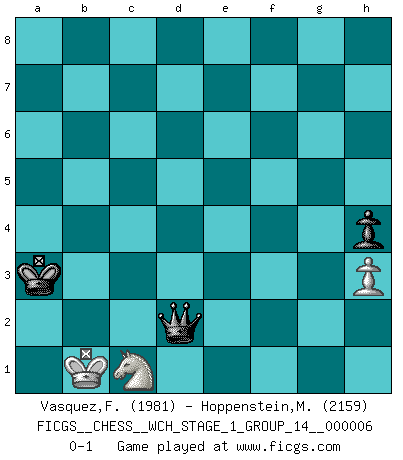 Last move : 0-1 2009 June 20 15:55:54 [Event "FICGS__CHESS__WCH_STAGE_1_GROUP_14__000006"] [Site "FICGS"] [Date "2009.02.03"] [Round "1"] [White "Vasquez,Fernando"] [Black "Hoppenstein,Michael"] [Result "0-1"] [WhiteElo "1981"] [BlackElo "2159"] 1.e4 c5 2.d4 cxd4 3.c3 dxc3 4.Nxc3 Nc6 5.Nf3 e6 6.Bc4 a6 7.O-O Nge7 8.Be3 b5 9.Bd3 Bb7 10.Re1 d6 11.Qb3 Na5 12.Qc2 Rc8 13.b4 Nc4 14.a4 Nxe3 15.Rxe3 Nc6 16.Qb2 Be7 17.axb5 axb5 18.Nd5 O-O 19.Nxe7+ Nxe7 20.h3 Bc6 21.Nd4 Qd7 22.Ra5 Rb8 23.Re1 Rb6 24.Rc1 Rfb8 25.Qa2 h6 26.Ra7 Bb7 27.Rc3 Qd8 28.Qc2 Rc8 29.Rxc8 Qxc8 30.Qxc8+ Nxc8 31.Ra5 e5 32.Nxb5 Ne7 33.Bf1 Kf8 34.f3 f5 35.exf5 Nxf5 36.Ra7 h5 37.Kf2 h4 38.Be2 g6 39.Ra4 Bc6 40.Ra5 d5 41.Na7 Bb7 42.Rb5 Rxb5 43.Nxb5 Ke7 44.Nc3 Nd4 45.Bd3 g5 46.Nd1 Ne6 47.b5 Nc5 48.Be2 d4 49.Ke1 Kd6 50.Nf2 Bc8 51.Nd1 Na4 52.Nf2 Nc3 53.Kd2 Kc5 54.Bd3 Bd7 55.Bf1 Bxb5 56.Bxb5 Nxb5 57.Ne4+ Kc4 58.Nxg5 Nd6 59.Ne6 d3 60.Ng5 Kd4 61.Ne6+ Kd5 62.Nc7+ Kc4 63.Ke3 Nf5+ 64.Kd2 Ng3 65.Ke1 e4 66.fxe4 Nxe4 67.Kd1 Kd4 68.Kc1 Nd6 69.Kd1 Nc4 70.Ke1 Ke4 71.Kd1 Kf4 72.Ke1 Kg3 73.Ne6 d2+ 74.Kd1 Kxg2 75.Nf4+ Kf3 76.Nd3 Ke3 77.Nb4 Nb2+ 78.Kc2 d1Q+ 79.Kxb2 Kd2 80.Ka3 Kc3 81.Na2+ Kc4 82.Kb2 Qd2+ 83.Kb1 Kb3 84.Nc1+ Ka3 0-1 Sicilian : Smith-Morra gambit Kingside Castling by player White (move 7) Kingside Castling by player Black (move 18) 10 pieces endgame at move 58 : White KNPPP , Black KNPPP WHITE : King + 1 Knight 3 Pawns BLACK : King + 1 Knight 3 Pawns 9 pieces endgame at move 66 : White KNPPP , Black KNPP WHITE : King + 1 Knight 3 Pawns BLACK : King + 1 Knight 2 Pawns 8 pieces endgame at move 66 : White KNPP , Black KNPP WHITE : King + 1 Knight 2 Pawns BLACK : King + 1 Knight 2 Pawns 7 pieces endgame at move 74 : White KNP , Black KNPP WHITE : King + 1 Knight 1 Pawn BLACK : King + 1 Knight 2 Pawns Promotion Queen by player Black (move 78) 6 pieces endgame at move 79 : White KNP , Black KQP WHITE : King + 1 Knight 1 Pawn BLACK : King + 1 Queen 1 Pawn Player Black won this chess game. Follow this game move after move (download)Man is a frivolous, a specious creature, and like a Chess player, cares more for the process of attaining his goal than for the goal itself. (Dostoyevsky) Je mehr ich von der FIDE weiss, um so weniger verstehe ich. (Alexander Kalifman) Los finales de Peón son del Ajedrez lo que el cesped es del Golf. (Cecil Purdy) Toute estimation doit être constamment réévaluée. (Jacob Estrin) Tree pose grows confidence. It roots me to this world. (Terri Guillemets)