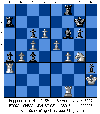 Last move : 1-0 2009 May 29 17:5:1 [Event "FICGS__CHESS__WCH_STAGE_1_GROUP_14__000006"] [Site "FICGS"] [Date "2009.02.03"] [Round "1"] [White "Hoppenstein,Michael"] [Black "Svensson,Leif"] [Result "1-0"] [WhiteElo "2159"] [BlackElo "1800"] 1.d4 Nf6 2.c4 g6 3.Nc3 Bg7 4.e4 d6 5.Nf3 O-O 6.h3 e5 7.d5 Na6 8.Bg5 h6 9.Be3 Nc5 10.Nd2 a5 11.Be2 Bd7 12.O-O Nh7 13.Nb5 Ng5 14.Bxc5 dxc5 15.h4 Nh7 16.h5 Nf6 17.hxg6 fxg6 18.Qb3 b6 19.Qg3 Kh7 20.Nc3 h5 21.a3 Ng4 22.Bxg4 Bxg4 23.Rfc1 Bh6 24.Rc2 Bf4 25.Qd3 h4 26.Nf1 h3 27.g3 Bh6 28.Nh2 Bd7 29.Nb5 Rc8 30.Rd1 a4 31.Na7 Ra8 32.Nb5 Kg8 33.Rc3 Bg5 34.Qe2 Qc8 35.d6 c6 36.Nc7 Ra7 37.Rf3 Rd8 38.b4 cxb4 39.axb4 Be6 40.Ra3 Bf6 41.Nxe6 Qxe6 42.c5 b5 43.Ng4 Kg7 44.Kh2 Rh8 45.f4 Rf8 46.Rf1 exf4 47.gxf4 Qc4 48.Qxc4 bxc4 49.e5 1-0 King's Indian : 5.Nf3 Kingside Castling by player Black (move 5) Kingside Castling by player White (move 12) Player White won this chess game. Follow this game move after move (download)The laws of Chess do not permit a free choice: you have to move whether you like it or not. (Emanuel Lasker) Schach ist ein schwarz-weisser Dschungel. (Garry Kasparov) El ganador de una partida es aquel jugador que hace el penúltimo error. (Savielly Tartakover) Les Echecs, c'est l'art de la guerre sans les charniers, c'est la résurrection des morts tombés au champ d'honneur, l'espoir perpétuel, la suprématie de l'intelligence sur la force, la culture de l'esprit. (F. Szpiner) When the going gets tactical, the computers get going. (Hyatt)