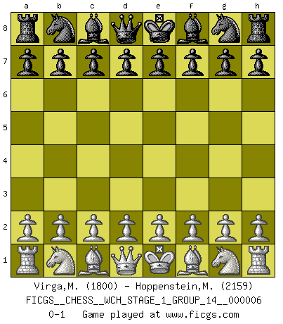 Last move : 0-1 2009 March 24 23:56:36 [Event "FICGS__CHESS__WCH_STAGE_1_GROUP_14__000006"] [Site "FICGS"] [Date "2009.02.22"] [Round "1"] [White "Virga,Maurizio Pietro"] [Black "Hoppenstein,Michael"] [Result "0-1"] [WhiteElo "1800"] [BlackElo "2159"] 0-1 This chess game has been lost on time (started : 2009.02.22 16:34:20) Player Black won this chess game. Follow this game move after move (download)In Chess, as it is played by masters, chance is practically eliminated. (Emanuel Lasker) Meine Liebe ist Schach, Schach, Schach. Ich muss jeden Tag Schach spielen, deshalb fühle ich mich so stark. (Miguel Najdorf) Debemos de asegurarnos de que el Ajedrez no se convierta en un lenguaje muerto, muy interesante, pero solo para un grupo muy pequeño. (Sytze Faber) Votre prénom est 'Tactique', votre deuxième prénom est 'Tactique' et votre nom est 'Tactique'. (Ken Smith) The Internet is the first thing that humanity has build that humanity doesn't understand, the largest experiment in anarchy that we have ever had. (Eric Schmidt)
