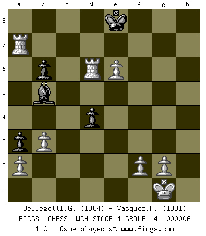 Last move : 1-0 2009 May 23 5:38:43 [Event "FICGS__CHESS__WCH_STAGE_1_GROUP_14__000006"] [Site "FICGS"] [Date "2009.02.03"] [Round "1"] [White "Bellegotti,Giorgio"] [Black "Vasquez,Fernando"] [Result "1-0"] [WhiteElo "1984"] [BlackElo "1981"] 1.d4 d5 2.c4 dxc4 3.Nf3 Nf6 4.e3 g6 5.Bxc4 Bg7 6.Nc3 Nc6 7.h3 O-O 8.e4 Nd7 9.Be3 Nb6 10.Be2 f5 11.exf5 Rxf5 12.O-O Be6 13.Bd3 Rb5 14.Bxb5 Nb4 15.Ng5 Bc8 16.Qb3+ N4d5 17.Nxd5 Nxd5 18.Bc4 c6 19.Rfe1 h6 20.Nf3 e6 21.Bd2 a5 22.Qd3 g5 23.h4 gxh4 24.Qg6 Qf6 25.Qxf6 Bxf6 26.Bxh6 Bd7 27.Bg5 Bg7 28.Bxh4 Bf8 29.Rad1 Bg7 30.Ne5 Bc8 31.Bd3 Ra7 32.Re4 a4 33.Rg4 a3 34.b3 b6 35.Nxc6 Rc7 36.Bg3 Rd7 37.Re1 Rf7 38.Nd8 Bd7 39.Nxf7 Kxf7 40.Bg6+ Kg8 41.Be5 Bxe5 42.dxe5 Kf8 43.Rc1 Ke7 44.Be4 Ke8 45.Bxd5 exd5 46.Rg6 Kd8 47.Rd6 Ke8 48.Rc7 Bb5 49.e6 d4 50.Ra7 1-0 QGA, Smyslov variation Kingside Castling by player Black (move 7) Kingside Castling by player White (move 12) Player White won this chess game. Follow this game move after move (download)A passed Pawn increases in strength as the number of pieces on the board diminishes. (Capablanca) Im Schach gibt es keinen Platz für Galanterie. (Irving Chernev) Nunca nadie ha ganado una partida de Ajedrez rindiendose. (Unknown) J'ai vu le vaincu d'Echecs jouer des années durant dans l'espoir de la fête de la victoire. Car tu es plus riche de ce qu'elle existe si même elle n'est point pour toi. Ainsi de la perle du fond des mers. (Antoine de Saint-Exupéry) An expert is a man who has made all the mistakes which can be made in a very narrow field. (Niels Bohr)