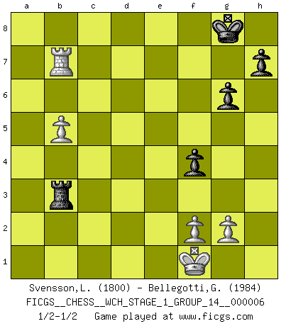 Last move : 1/2-1/2 2009 May 31 6:26:29 [Event "FICGS__CHESS__WCH_STAGE_1_GROUP_14__000006"] [Site "FICGS"] [Date "2009.02.03"] [Round "1"] [White "Svensson,Leif"] [Black "Bellegotti,Giorgio"] [Result "1/2-1/2"] [WhiteElo "1800"] [BlackElo "1984"] 1.e4 c5 2.c3 Nf6 3.e5 Nd5 4.Nf3 Nc6 5.Bc4 Nb6 6.Bb3 d5 7.exd6 Qxd6 8.O-O Be6 9.Na3 Bxb3 10.axb3 Qd3 11.Re1 e6 12.Re3 Qd5 13.d3 Be7 14.Nc4 O-O 15.Nfe5 Nxe5 16.Rxe5 Qd7 17.Re3 Nd5 18.Rh3 b5 19.Ne5 Qc7 20.Qh5 Nf6 21.Qe2 Bd6 22.Ng4 Nxg4 23.Qxg4 f5 24.Qh5 g6 25.Qe2 Rfe8 26.Bg5 e5 27.Qf3 e4 28.Qd1 exd3 29.Rxd3 Bxh2+ 30.Kf1 Be5 31.Rd7 Qc6 32.Qd5+ Qxd5 33.Rxd5 b4 34.Rxc5 bxc3 35.bxc3 Rac8 36.Rxc8 Rxc8 37.Bd2 Rc7 38.b4 Bxc3 39.Bxc3 Rxc3 40.Rxa7 Rb3 41.Rb7 f4 42.b5 1/2-1/2 Sicilian : Alapin's variation (2.c3) Kingside Castling by player White (move 8) Kingside Castling by player Black (move 14) 10 pieces endgame at move 40 : White KRPPP , Black KRPPP WHITE : King + 1 Rook 3 Pawns BLACK : King + 1 Rook 3 Pawns This chess game ended in a draw. Follow this game move after move (download)The chessboard is the world, the pieces are the phenomena of the Universe, the rules of the game are what we call the laws of Nature and the player on the other side is hidden from us. (Thomas Huxley) Modernes Schach sorgt sich zuviel um Dinge wie Bauernstruktur usw. Vergessen Sie das, Schachmatt beendet das Spiel! (Nigel Short) Tu eres para mi la Reina en d8 y yo soy el Peón en d7!!. (GM Eduard Gufeld) Le joueur d'Echecs qui veut atteindre le top est obligé de développer son propre credo créatif. Alexeï Stepanovicth Souétine. Il est facile d'écrire des livres ! Ce qui est difficile, c'est de jouer ! (Alexeï Stepanovicth Souétine) Whoever said the pen is mightier than the sword obviously never encountered automatic weapons. (US General Douglas MacArthur)