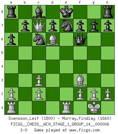 Last move : 1-0 2009 February 16 16:47:0 [Event "FICGS__CHESS__WCH_STAGE_1_GROUP_14__000006"] [Site "FICGS"] [Date "2009.02.03"] [Round "1"] [White "Svensson,Leif"] [Black "Murray,Findlay"] [Result "1-0"] [WhiteElo "1800"] [BlackElo "1660"] 1.e4 e5 2.Nf3 Nc6 3.d4 exd4 4.Nxd4 Qh4 5.Nc3 Bb4 6.Be2 Qxe4 7.Ndb5 Bxc3+ 8.bxc3 Kd8 9.O-O a6 10.Bf3 Qc4 11.Nd6 cxd6 12.Qxd6 Nge7 13.Bf4 Qe6 14.Qc7+ Ke8 15.Rfe1 Qf6 16.Bd6 1-0 Scotch : Steinitz variation Kingside Castling by player White (move 9) Player White won this chess game. Follow this game move after move (download)Spassky will not be psyched out by Fischer. (Mike Goodall) Die Leute spielen gegen mich seit 15 Jahren unter Ihren Möglichkeiten. (Robert James Fischer) Yo no le temo a Spassky. Todos saben que yo soy el mejor. Uno no necesita un torneo para probarlo. (Bobby Fischer) On entre au jeu d'Echecs comme on entre en Religion. Pour le joueur d'Echecs, la partie d'Echecs c'est l'office, la messe, le défilé du 1er Mai, le dépôt de gerbe au Monument aux Morts. C'est un drame sacré. (Michel Roos) See no evil, hear no evil, speak no evil. (The 3 monkeys)