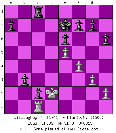 Last move : 0-1 2006 September 29 18:13:31 [Event "FICGS__CHESS__RAPID_B__000013"] [Site "FICGS"] [Date "2006.08.28"] [Round "1"] [White "Willoughby,Peter"] [Black "Plante,Marc-Eric"] [Result "0-1"] [WhiteElo "1741"] [BlackElo "1600"] 1.e4 c5 2.Nf3 d6 3.Bb5+ Bd7 4.Bxd7+ Qxd7 5.O-O Nc6 6.c3 Nf6 7.Re1 e6 8.d4 cxd4 9.cxd4 d5 10.e5 Ne4 11.Nc3 Nxc3 12.bxc3 Be7 13.a4 Na5 14.Ba3 Bxa3 15.Rxa3 Rc8 16.Qb1 Qe7 17.Qb4 Rc4 18.Qxa5 Qxa3 19.g3 Qxa4 20.Qxa4+ Rxa4 21.Ng5 Ke7 22.Rb1 b6 23.f4 Rc8 24.Rc1 h6 25.Nh3 Rxd4 26.Nf2 Rdc4 27.Nd1 d4 28.Kf2 dxc3 29.Ke3 b5 30.Kd3 c2 31.Ne3 Rc3+ 32.Kd2 Rxe3 33.Kxe3 b4 34.Kd2 b3 0-1 Sicilian : Canal-Sokolsky attack, 3...Bd7 Kingside Castling by player White (move 5) Player Black won this chess game. Follow this game move after move (download)My style is somewhere between that of Tal and Petrosian. (Reshevsky) Es ist besser die Steine des Gegners zu opfern. (Savielly Grigorievitsch Tartakower) Aún el Rey más flojo huye despavorido ante la amenaza de un Jaque doble. (Aaron Nimzowitsch) Mon pion favori sur ma case favorite ! Bronstein en parlant d'un coup de pion en h5 quand il avait les Noirs. May the force be with you. (Han Solo in Star Wars ep.4)