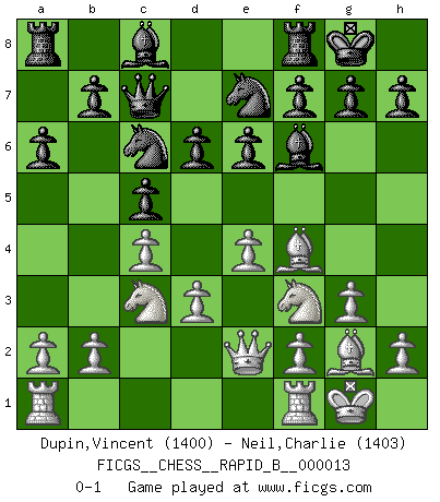 Last move : 0-1 2006 November 1 2:15:53 [Event "FICGS__CHESS__RAPID_B__000013"] [Site "FICGS"] [Date "2006.08.28"] [Round "1"] [White "Dupin,Vincent"] [Black "Neil,Charlie"] [Result "0-1"] [WhiteElo "1400"] [BlackElo "1403"] 1.e4 e6 2.Qe2 c5 3.Nf3 Nc6 4.g3 Qc7 5.Bg2 Be7 6.O-O Bf6 7.c4 Nge7 8.Nc3 d6 9.d3 O-O 10.Bf4 a6 0-1 This chess game has been lost on time (started : 2006.08.28 9:46:28) French : Chigorin variation Kingside Castling by player White (move 6) Kingside Castling by player Black (move 9) Player Black won this chess game. Follow this game move after move (download)Chess is imagination. (David Bronstein) Über Frauen: Chess is better. (Robert James Fischer) Repentinamente, me resultaba obvio en mi analisis que yo había pasado por alto lo que Fischer había visto en el tablero con la mas grande facilidad. (Mikhail Botvinnik) Roi des jeux et jeu des rois, les échecs portent en eux un sentiment d'infini. Ils donnent à celui qui s'est efforcé d'en approfondir les arcanes l'impression de n'être pas à la mesure de l'homme; en fait, ils constituent un résumé de l'univers, un microcosme, et figurent cette grande échelle qui, dans les plans de la lumière descend jusqu'à la matière, qui des abîmes insondables remonte jusqu'en l'infini de Dieu. (Pyrame) If you work for a living, why do you kill yourself working ? (Tuco to a chicken in The Good, The Bad and The Ugly)