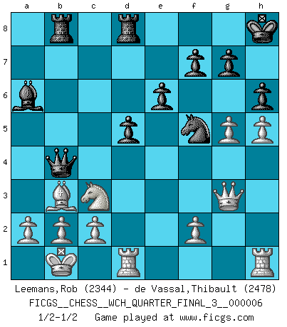 Last move : 1/2-1/2 2009 May 14 14:10:36 [Event "FICGS__CHESS__WCH_QUARTER_FINAL_3__000006"] [Site "FICGS"] [Date "2009.02.03"] [Round "4"] [White "Leemans,Rob"] [Black "de Vassal,Thibault"] [Result "1/2-1/2"] [WhiteElo "2344"] [BlackElo "2478"] 1.e4 c5 2.Nf3 Nc6 3.d4 cxd4 4.Nxd4 Nf6 5.Nc3 d6 6.Bg5 e6 7.Qd2 a6 8.O-O-O h6 9.Nxc6 bxc6 10.Bf4 d5 11.Qe3 Be7 12.Be2 O-O 13.h4 Re8 14.Qg3 Kh8 15.Bc7 Qd7 16.Be5 a5 17.Qf4 a4 18.Kb1 Rf8 19.exd5 cxd5 20.Bb5 Qb7 21.Bxa4 Ng8 22.Bd6 Qb6 23.Bxe7 Nxe7 24.Bb3 Ba6 25.g4 Rab8 26.h5 Qb4 27.Qg3 Rfd8 28.g5 Nf5 1/2-1/2 Sicilian defense Queenside Castling by player White (move 8) Kingside Castling by player Black (move 12) This chess game ended in a draw. Follow this game move after move (download)What is the difference between chess and football? Everybody understands football, but nobody plays it. Everybody plays chess, but nobody understands it. Everything is relative. (Vladimir Kramnik) Capablanka war das größte Genie der Schachgeschichte! Aber denken sie nicht er habe nichts vom Schach verstanden. Er wusste nur soviel wie er wissen musste um seine Ziele zu erreichen. (Mikhail Moiseyevich Botvinik) Peones: ellos son el alma de esta partida, solos forman el ataque y la defensa. (Philidor) L'action d'une oeuvre littéraire se déroule sur un champ de bataille. Les masques et les types du drame moderne correspondent aux pièces du jeu d'échecs. L'intrigue correspond aux coups et aux gambits, c'est à dire aux techniques du jeu telles qu'utilisées et interprétées par les joueurs. Les tactiques et les péripéties [mouvements] correspondent aux coups exécutés par l'adversaire. (Viktor Shklovsky) Sometimes it pays to stay in bed in Monday, rather than spending the rest of the week debugging Monday's code. (Dan Salomon)