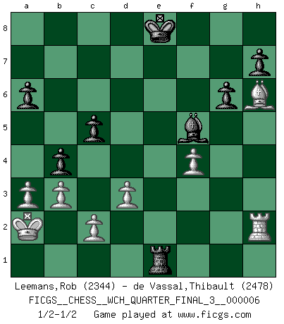 Last move : 1/2-1/2 2009 May 17 0:27:28 [Event "FICGS__CHESS__WCH_QUARTER_FINAL_3__000006"] [Site "FICGS"] [Date "2009.02.03"] [Round "8"] [White "Leemans,Rob"] [Black "de Vassal,Thibault"] [Result "1/2-1/2"] [WhiteElo "2344"] [BlackElo "2478"] 1.e4 c5 2.Nf3 Nc6 3.Nc3 Nf6 4.Bb5 g6 5.e5 Ng4 6.Bxc6 dxc6 7.h3 Nh6 8.g4 Bg7 9.d3 O-O 10.Be3 f5 11.exf6 exf6 12.Qd2 Nf7 13.Bxc5 Re8+ 14.Be3 f5 15.gxf5 Bxf5 16.O-O-O b5 17.Ng5 Nxg5 18.Bxg5 Qa5 19.Bh6 Be5 20.Rde1 b4 21.Nd1 c5 22.Kb1 Re6 23.f4 Bh8 24.Rxe6 Bxe6 25.b3 Qd8 26.Qe3 Qf6 27.Qe5 Re8 28.Qxf6 Bxf6 29.Re1 Kf7 30.Nf2 Bh4 31.Re2 Bxf2 32.Rxf2 Bxh3 33.Kb2 Bg4 34.a3 a6 35.Rg2 Bf5 36.Rh2 Re1 37.Ka2 Ke8 1/2-1/2 Sicilian defense Kingside Castling by player Black (move 9) Queenside Castling by player White (move 16) This chess game ended in a draw. Follow this game move after move (download)Chess is a terrible game. If you have no center, your opponent has a freer position. If you do have a center, then you really have something to worry about ! (Siegbert Tarrasch) Eine Person mit durchschnittlichem IQ kann etwa eine ELO von 2000 erreichen. (Jonathan Levitt) Un sacrificio se refuta mucho mejor al aceptarlo. (Wilhelm Steinitz) Les écrivains ont utilisé les échecs pour analyser les côtés extrêmes de la nature humaine. Dans ce cadre, les échecs offrent un champ d'expérimentation idéal. Mais on pourrait faire la même chose avec la peinture. Et là, en vous référant à Van Gogh, vous ne tirerez pas de conclusion définitive sur les peintres. (Gary Kasparov) Live, lose, and learn, by observing your opponent how to win. (Amber Steenbock)
