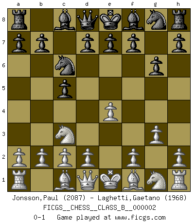 Last move : 0-1 2006 June 2 21:17:44 [Event "FICGS__CHESS__CLASS_B__000002"] [Site "FICGS"] [Date "2006.04.16"] [Round "1"] [White "Jonsson,Paul"] [Black "Laghetti,Gaetano"] [Result "0-1"] [WhiteElo "2087"] [BlackElo "1968"] 1.e4 c5 2.Nc3 Nc6 3.g3 g6 0-1 This chess game has been lost on time (started : 2006.04.16 20:10:47) Sicilian : Closed Player Black won this chess game. Follow this game move after move (download)Chess is a fairy tale of 1001 blunders. (Savielly Tartakower) Schach ist Leben. (Robert James Fischer) Bobby solo arroja las piezas y solas caen en las casillas correctas. (Miguel Najdorf ) Les erreurs sont comme les malheurs, elles n'arrivent jamais seules. (Siegbert Tarrasch) Political correctness is subjecting us to gross incompetence. (Johann Piek)