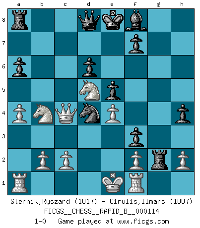 Last move : 1-0 2009 March 2 14:5:49 [Event "FICGS__CHESS__RAPID_B__000114"] [Site "FICGS"] [Date "2009.02.03"] [Round "1"] [White "Sternik,Ryszard"] [Black "Cirulis,Ilmars"] [Result "1-0"] [WhiteElo "1817"] [BlackElo "1887"] 1.e4 c5 2.Nf3 Nc6 3.d4 cxd4 4.Nxd4 Nf6 5.Nc3 e6 6.Ndb5 d6 7.Bf4 e5 8.Bg5 a6 9.Bxf6 gxf6 10.Na3 h5 11.Nc4 f5 12.Bd3 b5 13.Ne3 f4 14.Ned5 Rg8 15.Rg1 h4 16.a4 b4 17.Na2 Bg4 18.Be2 Bxe2 19.Qxe2 Nd4 20.Qc4 f3 21.Naxb4 Rxg2 22.Rf1 1-0 Sicilian defense Player White won this chess game. Follow this game move after move (download)First-class players lose to second-class players because second-class players sometimes play a first-class game. (Siegbert Tarrasch) Die Fehler sind da, Sie warten nur darauf gemacht zu werden. (Savielly Grigorievitsch Tartakower) En el Ajedrez, cuando menos, el valiente hereda la tierra. (Edmar Mednis) Les Echecs ne sont pas pour les âmes timides. Ils requièrent un homme entier, qui ne s'arrête pas aveuglément à ce qui a été déjà établi, mais qui tente individuellement de sonder les profondeurs du jeu. (W. Steinitz) Every now and then a man's mind is stretched by a new idea and never shrinks back to its former dimensions. (Oliver Wendell Holmes, Sr.)