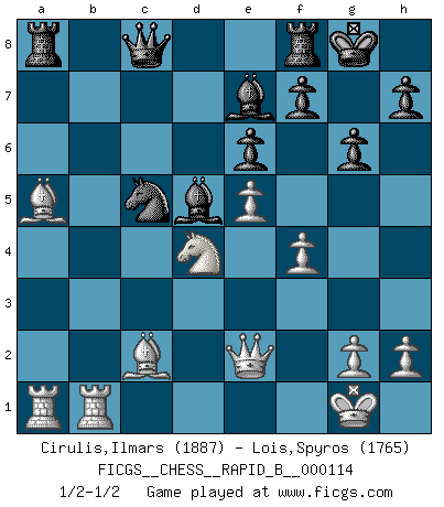 Last move : 1/2-1/2 2009 March 22 7:35:46 [Event "FICGS__CHESS__RAPID_B__000114"] [Site "FICGS"] [Date "2009.02.03"] [Round "1"] [White "Cirulis,Ilmars"] [Black "Lois,Spyros"] [Result "1/2-1/2"] [WhiteElo "1887"] [BlackElo "1765"] 1.d4 d5 2.c4 e6 3.Nc3 Nf6 4.e3 Bb4 5.cxd5 Nxd5 6.Bd2 O-O 7.Nf3 Be7 8.a3 b6 9.Bd3 Bb7 10.Nxd5 Bxd5 11.e4 Bb7 12.O-O c5 13.Bc3 Nd7 14.Qe2 cxd4 15.Nxd4 Nc5 16.Bc2 Qe8 17.Qg4 g6 18.a4 Rd8 19.Rfd1 a5 20.Qe2 Bg5 21.b4 axb4 22.Bxb4 Be7 23.a5 bxa5 24.Bxa5 Ra8 25.f4 Qb8 26.e5 Bd5 27.Rdb1 Qc8 1/2-1/2 QGD : 3...Nf6 Kingside Castling by player Black (move 6) Kingside Castling by player White (move 12) This chess game ended in a draw. Follow this game move after move (download)Mistrust is the most necessary characteristic of the Chess player. (Siegbert Tarrasch) Der Umstand, daß uns eine 7 Stunden Zeitkontrolle ermöglicht eine großartige, tiefe Partie zu spielen, ist für die Massenmedien nicht weiter von Bedeutung. (Alexej Shirov) Cuando tengo las piezas blancas, yo gano porque soy blanco; Cuando tengo las piezas negras, yo gano porque soy Bogolyubov. (Bogolyubov) Vous n'êtes pas toujours obligé de jouer le meilleur coup. Un coup doit être actif, entreprenant, correct et beau ! (David Bronstein) Either move or be moved. (Ezra Pound)