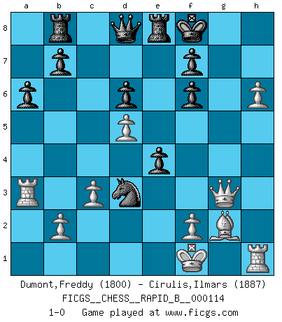 Last move : 1-0 2009 March 22 5:58:34 [Event "FICGS__CHESS__RAPID_B__000114"] [Site "FICGS"] [Date "2009.02.03"] [Round "1"] [White "Dumont,Freddy"] [Black "Cirulis,Ilmars"] [Result "1-0"] [WhiteElo "1800"] [BlackElo "1887"] 1.e4 c5 2.Nf3 Nc6 3.d4 cxd4 4.Nxd4 Nf6 5.Nc3 e5 6.Ndb5 d6 7.Bg5 a6 8.Na3 Be6 9.Nc4 h5 10.a4 h4 11.a5 h3 12.Nd5 Be7 13.Bxf6 Bxf6 14.c3 hxg2 15.Bxg2 O-O 16.Ncb6 Rb8 17.h4 Re8 18.Qf3 Nxa5 19.Nxf6+ gxf6 20.Nd5 Bxd5 21.exd5 Kf8 22.h5 Nb3 23.Ra3 Nc5 24.h6 e4 25.Qg3 Nd3+ 26.Kf1 1-0 Sicilian : Pelikan (Lasker/Sveshnikov) variation Kingside Castling by player Black (move 15) Player White won this chess game. Follow this game move after move (download)Weak points or holes in the opponent's position must be occupied by pieces not Pawns. (Siegbert Tarrasch) Bogoljubow: Matt in vier Zügen! Tartakower: Ich verbitte mir jede Belästigung! (Savielly Grigorievitsch Tartakower) Solo puedes ser bueno en el Ajedrez si amas al juego. (Bobby Fischer) On peut tirer plus d'utilité d'une partie perdue que de 100 parties gagnées. (Capablanca) In God we trust, all others we virus scan. (Anonymous)