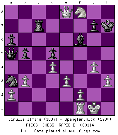 Last move : 1-0 2009 May 19 2:25:23 [Event "FICGS__CHESS__RAPID_B__000114"] [Site "FICGS"] [Date "2009.02.03"] [Round "1"] [White "Cirulis,Ilmars"] [Black "Spangler,Rick"] [Result "1-0"] [WhiteElo "1887"] [BlackElo "1780"] 1.d4 d5 2.c4 c6 3.Nc3 Nf6 4.cxd5 cxd5 5.Nf3 Nc6 6.Qb3 e6 7.Bf4 a6 8.e3 Be7 9.h3 O-O 10.Bd3 b5 11.O-O Bd7 12.Rac1 Na5 13.Qc2 Rc8 14.Qe2 Nc4 15.b3 Na3 16.Ne5 Qa5 17.Bg5 Rc7 18.Bh4 Rfc8 19.Bxf6 Bxf6 20.Bxh7+ Kxh7 21.Qh5+ Kg8 22.Qxf7+ Kh8 23.Nxd7 Rxc3 24.Rxc3 Rxc3 25.Qe8+ Kh7 26.Nf8+ Kg8 27.Nxe6 Kh7 28.g4 Rc7 29.Nf8+ 1-0 QGD Slav defense Kingside Castling by player Black (move 9) Kingside Castling by player White (move 11) Player White won this chess game. Follow this game move after move (download)The most powerful weapon in Chess is to have the next move. (David Bronstein) Schach ist ein Teil der Kultur, und wenn es mit der Kultur abwärts geht, geht es auch mit dem Schach abwärts. (Mikhail Moiseyevich Botvinik) La vida es como el Ajedrez, con lucha, competición y eventos buenos y malos. (Benjamin Franklin) Le moment que je préfère le plus dans une rencontre, c'est celui où je sens que la personnalité de l'adversaire se brise. (Robert Fischer) Coffee just isn't my cup of tea. (Unknown)