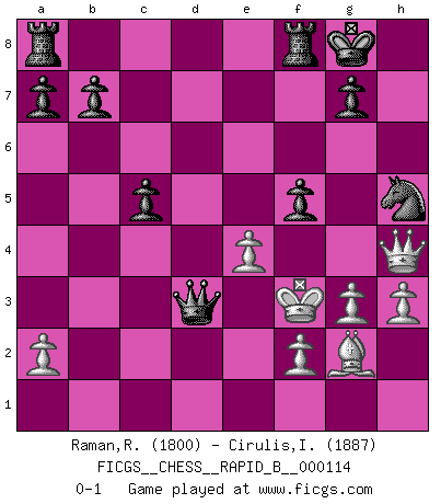 Last move : 0-1 2009 May 14 18:37:40 [Event "FICGS__CHESS__RAPID_B__000114"] [Site "FICGS"] [Date "2009.02.03"] [Round "1"] [White "Raman,Ranganathan"] [Black "Cirulis,Ilmars"] [Result "0-1"] [WhiteElo "1800"] [BlackElo "1887"] 1.g3 e5 2.Bg2 d5 3.e3 Nf6 4.c3 Bd6 5.h3 e4 6.d4 exd3 7.Qxd3 O-O 8.Nd2 Nbd7 9.Ngf3 Nc5 10.Qd4 Bf5 11.O-O Qd7 12.Re1 Nd3 13.Rd1 c5 14.Qh4 Be7 15.Ng5 h6 16.Ndf3 hxg5 17.Nxg5 Nh7 18.e4 Nxc1 19.Rxd5 Qb5 20.Rxf5 Bxg5 21.Rxg5 Qxb2 22.Rh5 Ne2+ 23.Kf1 Qxa1+ 24.Kxe2 Qb2+ 25.Kf3 Qxc3+ 26.Kg4 Nf6+ 27.Kf4 Qd2+ 28.Kf5 Nxh5 29.Kg4 f5+ 30.Kf3 Qd3+ 0-1 Benko's Opening Kingside Castling by player Black (move 7) Kingside Castling by player White (move 11) Player Black won this chess game. Follow this game move after move (download)Chess is a terrific way for kids to build self image and self esteem. (Saudin Robovic) Mein Name ist Rustam Kamsky. Sie haben meinen Sohn belästigt. Bereiten Sie sich aufs Sterben vor. (Rustam Kamsky) Realmente no sabemos como el juego fue inventado, aunque hay sospechas. Tan pronto como descubramos a los culpables, se los haremos saber. (Bruce Pandolfini) Aux échecs, les retours au sommet sont rares : les dommages psychologiques consécutifs à une défaite sont trop sévères. (Daily Telegraph) The leaves of memory seemed to make a mournful rustling in the dark. (Henry Wadsworth Longfellow)