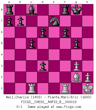 Last move : 0-1 2006 October 24 9:2:15 [Event "FICGS__CHESS__RAPID_B__000013"] [Site "FICGS"] [Date "2006.08.28"] [Round "1"] [White "Neil,Charlie"] [Black "Plante,Marc-Eric"] [Result "0-1"] [WhiteElo "1403"] [BlackElo "1600"] 1.e4 c5 2.Nc3 d6 3.g3 g6 4.Bg2 Bg7 5.d3 Nc6 6.Nge2 e6 7.Be3 Nd4 8.Qd2 Ne7 9.O-O O-O 10.Bh6 Bxh6 11.Qxh6 Nxc2 12.Rac1 Nd4 13.f4 Nxe2+ 14.Nxe2 Qb6 15.Kh1 Qxb2 16.Ng1 f6 17.f5 gxf5 18.Nh3 Qxa2 19.Nf4 e5 20.Nh5 Qf7 21.Bh3 Qg6 22.Qxg6+ hxg6 23.Nf4 exf4 24.Rxf4 g5 25.R4f1 fxe4 26.Bg2 exd3 0-1 Sicilian : Closed Kingside Castling by player White (move 9) Kingside Castling by player Black (move 9) Player Black won this chess game. Follow this game move after move (download)At this time Fischer is simply a level above all the best Chessplayers in the world. (John Jacobs) Gott hat gewollt, dass ich Champion werde. (Surab Azmajparaschvili) Alekhine es un poeta que crea un trabajo de arte de algo que raramente inspiraría a otra persona a mandar una tarjeta postal. (Max Euwe) Il s'avisa de me proposer d'apprendre les échecs qu'il jouait un peu... me voilà forcené des échecs. J'achète un échiquier, je m'enferme dans ma chambre, j'y passe des jours et des nuits à vouloir apprendre par cur toutes les parties. (Jean-Jacques Rousseau, Confessions) The only difference between a tax man and a taxidermist is that the taxidermist leaves the skin. (Mark Twain)
