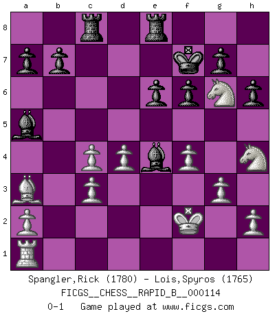 Last move : 0-1 2009 February 24 22:23:41 [Event "FICGS__CHESS__RAPID_B__000114"] [Site "FICGS"] [Date "2009.02.03"] [Round "1"] [White "Spangler,Rick"] [Black "Lois,Spyros"] [Result "0-1"] [WhiteElo "1780"] [BlackElo "1765"] 1.d4 d5 2.Nf3 e6 3.e3 Nf6 4.Bd3 c5 5.c3 Nc6 6.Nbd2 cxd4 7.exd4 Bd6 8.O-O O-O 9.Re1 Re8 10.Ne5 h6 11.f4 Bd7 12.Ndf3 Rc8 13.Be3 Ne4 14.g3 f6 15.Ng6 Na5 16.Bc1 Nc4 17.Bxe4 dxe4 18.Rxe4 Qa5 19.Nfh4 Bc7 20.Qe1 Qd5 21.b3 Bc6 22.bxc4 Qxe4 23.Qxe4 Bxe4 24.Ba3 Kf7 25.Kf2 Ba5 0-1 Queen's pawn game Kingside Castling by player White (move 8) Kingside Castling by player Black (move 8) Player Black won this chess game. Follow this game move after move (download)Half the variations which are calculated in a tournament game turn out to be completely superfluous. Unfortunately, no one knows in advance which half. (Jan Tinman) Wenn Du absolut nicht mehr weißt, was Du tun sollst, dann ist es Zeit für Panik. (John van der Wiel) ¿Porque tengo que perder ante este idiota?. (Aron Nimzovich) La vie et les Echecs sont tous les deux une lutte constante. (Lasker) That's absurd. I love it. (Gregory House, House M.D.)