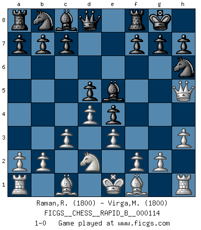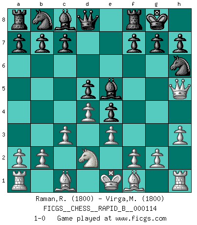 Last move : 1-0 2009 March 13 22:38:45 [Event "FICGS__CHESS__RAPID_B__000114"] [Site "FICGS"] [Date "2009.02.03"] [Round "1"] [White "Raman,Ranganathan"] [Black "Virga,Maurizio Pietro"] [Result "1-0"] [WhiteElo "1800"] [BlackElo "1800"] 1.e3 d5 2.c3 e5 3.Nf3 e4 4.Ne5 Bd6 5.d4 Nh6 6.h3 O-O 7.Nd2 Bxe5 8.Qh5 1-0 This chess game has been lost on time (started : 2009.02.03 22:47:56) Van't Kruijs Opening Kingside Castling by player Black (move 6) Player White won this chess game. Follow this game move after move (download)There are two classes of men; those who are content to yield to circumstances and who play whist; those who aim to control circumstances, and who play Chess. (Mortimer Collins) Strategie ist, wie man ein Mädchen auf den Rücksitz bekommt. Taktik ist, was man tut, wenn man dann dort ist. (Anonymous) Uno no tiene que jugar muy bien, es suficiente jugar mejor que el oponente. (Siegbert Tarrasch) Les Echecs ne sont pas pour les âmes timides. Ils requièrent un homme entier, qui ne s'arrête pas aveuglément à ce qui a été déjà établi, mais qui tente individuellement de sonder les profondeurs du jeu. (W. Steinitz) Chess is as much a mystery as women. (Purdy)
