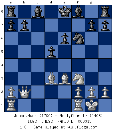 Last move : 1-0 2006 September 10 11:1:20 [Event "FICGS__CHESS__RAPID_B__000013"] [Site "FICGS"] [Date "2006.08.28"] [Round "1"] [White "Josse,Mark"] [Black "Neil,Charlie"] [Result "1-0"] [WhiteElo "1700"] [BlackElo "1403"] 1.e4 e6 2.d4 d5 3.Nd2 Nf6 4.e5 Nfd7 5.Bd3 c5 6.c3 Nc6 7.Ngf3 Qb6 8.O-O f6 9.Qe2 cxd4 10.exf6 Nxf6 11.Nxd4 Nxd4 12.cxd4 Qxd4 13.Nf3 Qb6 14.Be3 Qxb2 15.Qxb2 1-0 French : Tarrasch, Closed variation Kingside Castling by player White (move 8) Player White won this chess game. Follow this game move after move (download)It was clear to me that the vulnerable point of the American Grandmaster (Bobby Fischer) was in double-edged, hanging, irrational positions, where he often failed to find a win even in a won position. (Efim Geller) Kritik überlasse ich den Spießern. Ich zeige nichts, wofür ich mich schämen muss. (Alexandra Kosteniuk) Si un gobernante no entiende al Ajedrez, ¿como puede governar él un reinado?. (El Rey Khusros II) Aux échecs, les retours au sommet sont rares : les dommages psychologiques consécutifs à une défaite sont trop sévères. (Daily Telegraph) All politicians must be presumed guilty until they are proven innocent. (Dinesh De Silva)